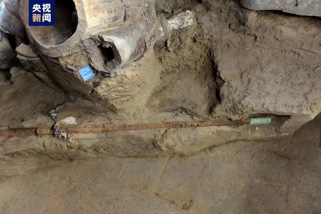 △一把炭化的弓弩倾倒在兵俑残片中间