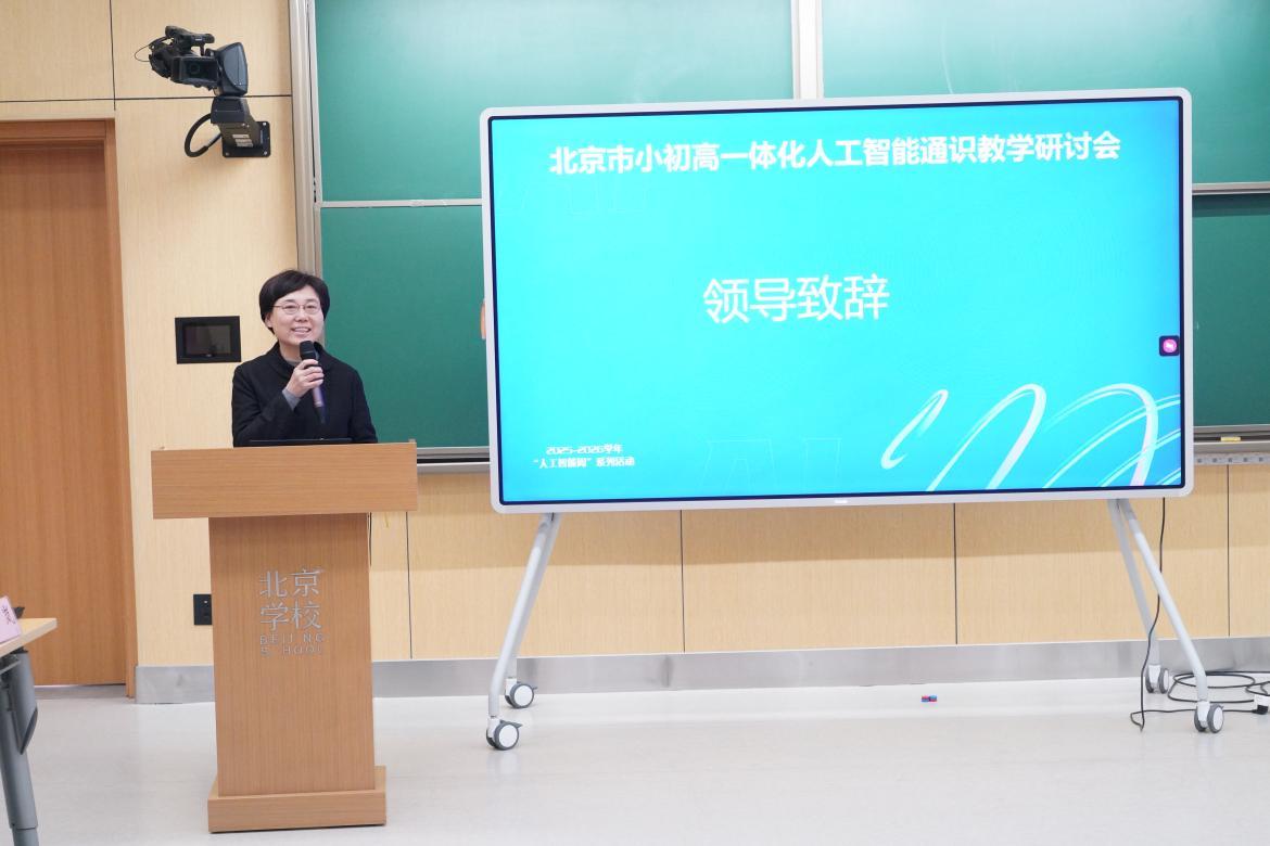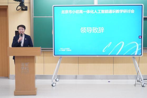 北京学校校长、人大附中通州校区校长刘小恵在致辞中回顾了学校在人工智能课程建设方面的成果。作为“大中小学一体化人工智能通识课研究联盟”成员及“人工智能课程建设孵化场”,学校将持续推动人工智能教育从理论走向课堂,完善一体化课程体系,为人工智能教育的普及与发展贡献力量。
