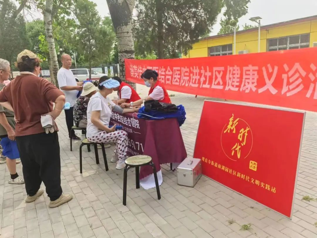 盛春坊、南湖园社区新时代文明实践站开展义诊进社区服务活动。医护人员为社区居民提供测量血压、中医看诊等服务。