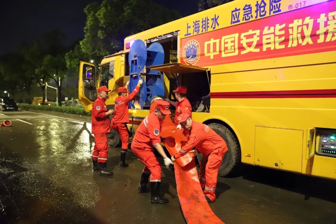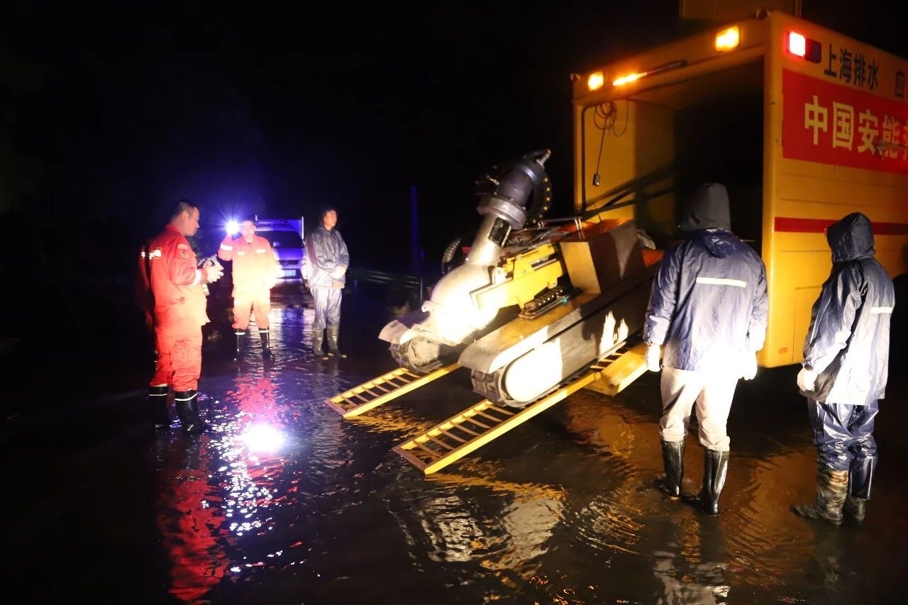 7月31日下午,台风雨带发威,普陀区遭遇短时极端强降雨,小时最大雨量突破100毫米,祁连山南路隧道、真北路桃浦路等地段积水严重,交通几近中断,市民出行安全受到威胁。指令传来,抢险队火速集结18名队员,调集5台大流量“龙吸水”等大型排涝装备,迎着狂风暴雨,向积水最深、情况最急的区域挺进。