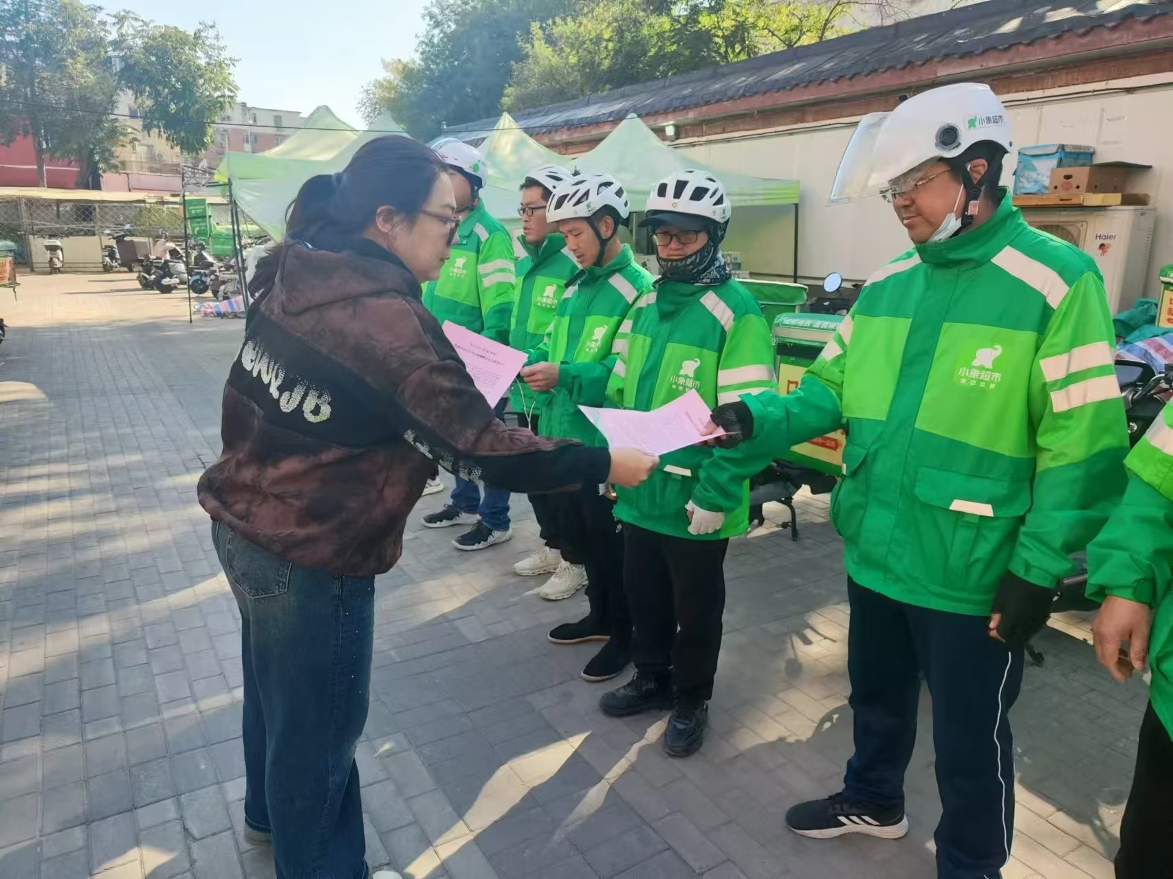 京西商务中心商住楼宇工作站的工作人员通过“面对面”宣讲和发放倡议书的方式,用通俗易懂的语言向过往的居民、企业职工、“骑手”小哥讲解电动自行车出行的安全规定,提醒大家无论何时出行都要佩戴好安全头盔。(责编 邓力)