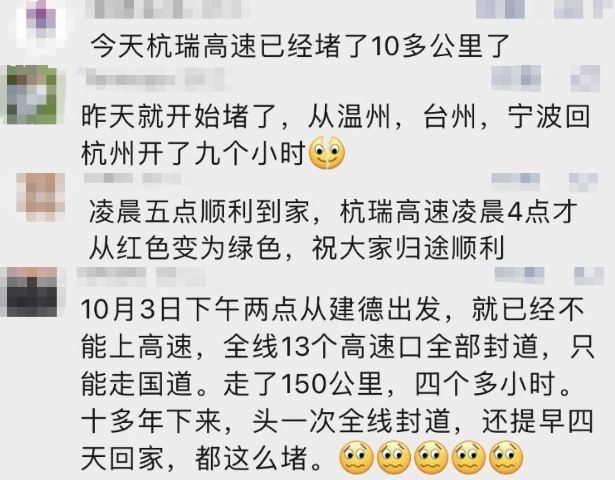 10月4日,就有网友表示,早上6点从江西宜春出发去深圳,开了12个小时的车,还没出江西。还有网友称,3号左右就提前返程,没想到高速上车辆依旧拥堵,10多公里的路程能走1个多小时。