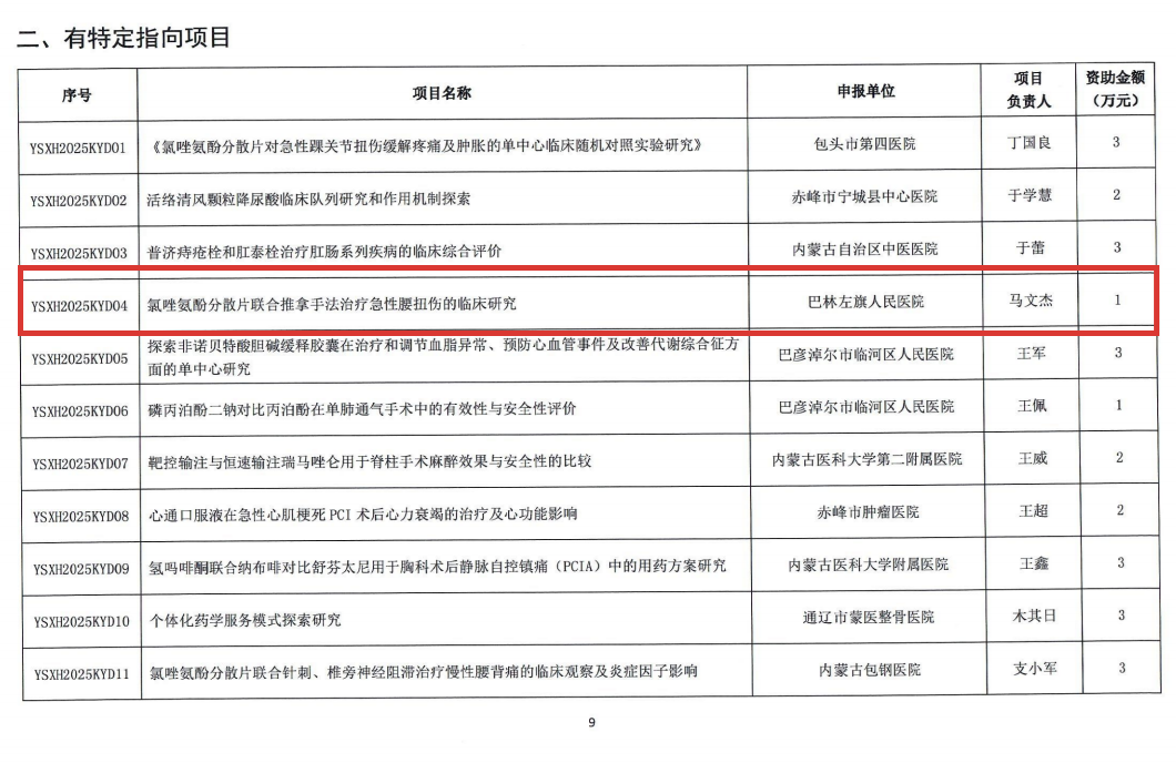 京蒙协作再结硕果!北京中医医院顺义医院推拿科医生苗静与巴林左旗人民医院康复科医生马文杰联合申报的《氯唑氨酚分散片联合推拿手法治疗急性腰扭伤的临床研究》项目,成功获批内蒙古自治区医师协会临床医学研究和临床新技术推广立项。这一成果实现了巴林左旗人民医院在内蒙古自治区级科研项目申报上“零”的突破。