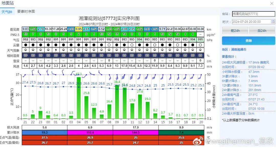 ↑ 湖南湘潭24小时雨量281.6刷新纪录。(来源:@weatherman_信欣)
