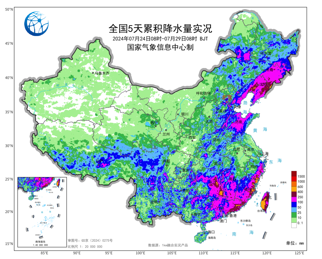 中央气象台统计,受第3号台风“格美”影响,7月24日至28日,台湾、福建、浙江、江西、湖南、广东等地部分地区累计降雨300~600毫米,福建、浙江、湖南局地700~875毫米。同时,辽宁中东部、吉林东部等地也出现持续强降雨,累计降雨量100~300毫米,辽宁沈阳和鞍山、吉林通化等地400~614毫米。