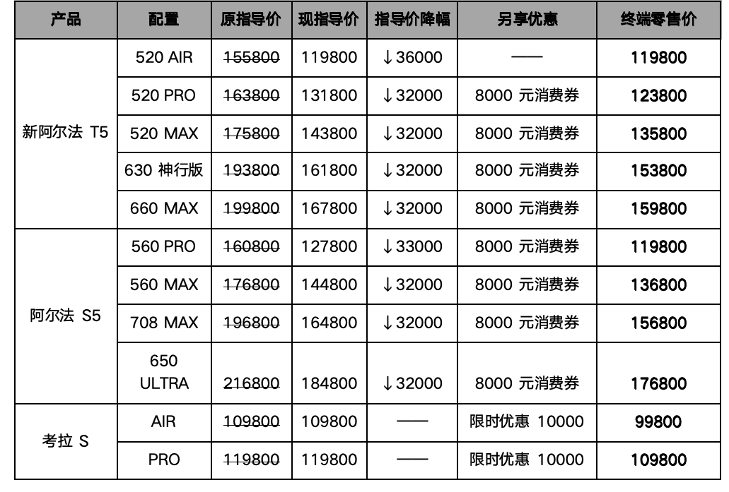 即日起,极狐对新阿尔法T5和阿尔法S5官方指导价进行下调,官方降价32000元,还可另享8000元消费券,如此一来,5系“双子星”终端零售价最低仅需11.98万元;考拉S限时优惠增至10000元,终端零售价直接下探到了9.98万元起。