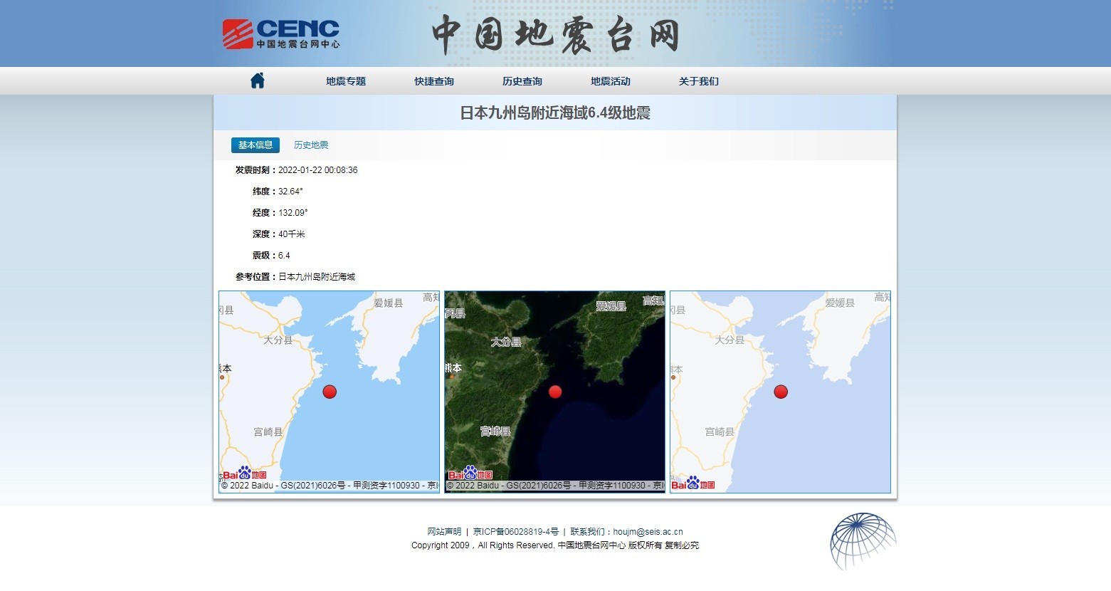 2022年1月22日0时8分(北京时间),日本四国岛海域(32.78 N,132.10 E)发生6.5级地震,震源深度为59.2千米。自然资源部海啸预警中心根据监测数据分析,此次地震没有监测到海啸。