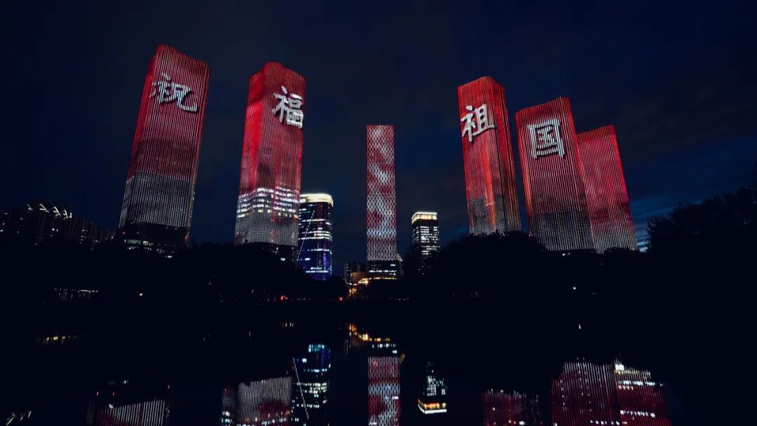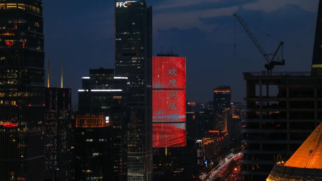 待夜幕降临,北京奥林匹克塔、大望京建筑组群、CBD区域等地标性的摩天楼群,共同披上了节日的盛装。国庆主题灯光秀中灵动的光影交织成飘逸的绸带与吉祥的云纹,映照着象征繁荣的牡丹与壮丽的山水;“祝福祖国,欢度国庆”的字样在楼宇间流转,在夜空中勾勒出一幅“花团锦簇”的喜庆画卷,将国庆佳节的欢乐祥和与祖国繁荣昌盛的无限魅力展现得淋漓尽致。