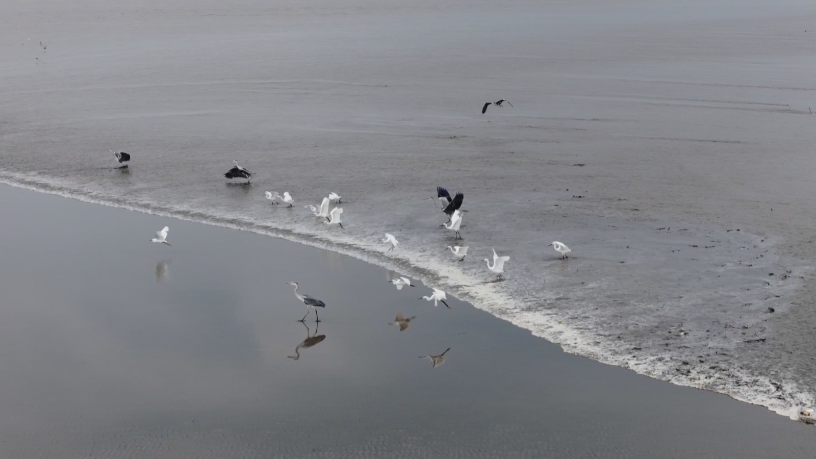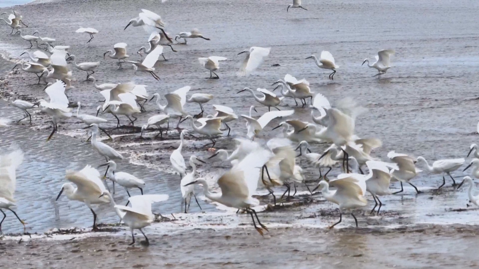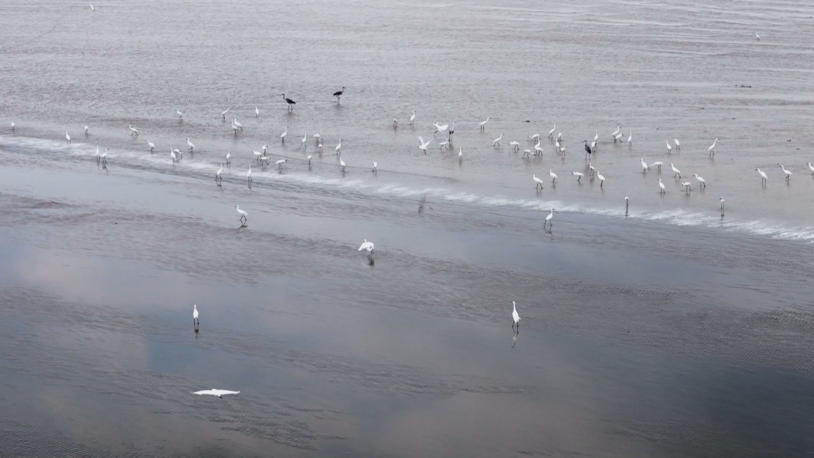 杭州大江东产业集聚区绿色生态公益服务中心发起人 郑建江:最主要是这边这个沙滩比较宽阔,这里过去有两三公里都是沙滩,潮水过来的时候有小鱼小虾带过来的很多白鹭、苍鹭、还有白琵鹭都会汇聚在这里抓鱼吃,排成一排的时候是很壮观的。