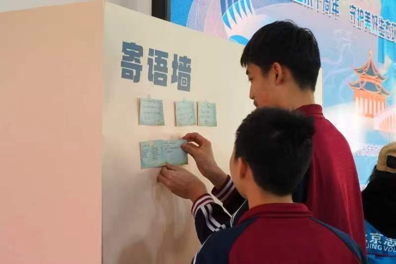 活动中,来自京堰两地五名志愿服务宣讲员,分别从丹江口水库建设历程、库区移民搬迁、“文明河流”建设、守水护水节水、感恩回馈十堰等方面,讲述了南水北调中线工程建设过程中的感人故事,抒发了京堰两地共同守护一库碧水、确保“一泓清水永续北送”的浓厚情怀。活动最后,来自湖北省十堰市的宣讲员与展览路街道干部共同朗诵《京堰一家亲 共护一江水》,志愿者、师生和居民现场写下卡片寄语,共树守水护水节水的环保理念。