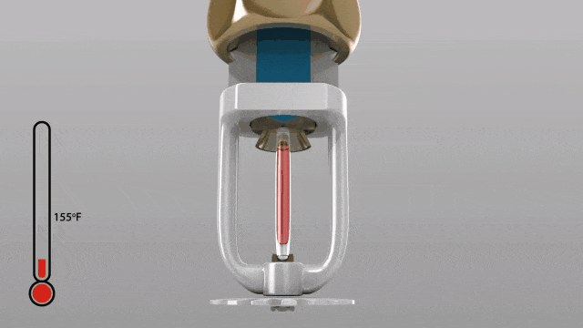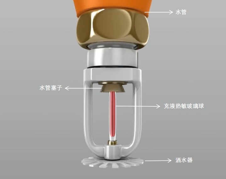 火灾发生时,起火部位燃烧反应逐渐加剧,大量高温烟气或火焰辐射温度向顶棚传递,一旦达到热敏玻璃球的额定工作温度,其内部液体将迅速反应膨胀,使玻璃球破裂,从而自动开启喷淋。