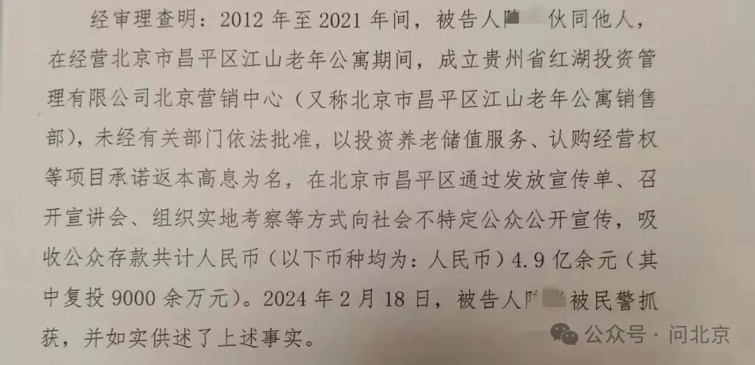 杨女士向记者出示了北京市昌平区人民法院的一审刑事判决书。判决书显示:2012年至2021年间,两名被告人未经金融监管部门批准,以养老项目承诺返本高息为名,向社会不特定公众非法吸收公众存款共计4.9亿多元(其中复投9000余万元)。二人均因犯非法吸收公众存款罪被判处刑罚:被告人许某某获刑九年,并处罚金人民币一百万元;被告人陈某获刑十四年,与此前因同一罪名所判刑期并罚后,决定执行有期徒刑十五年,并处罚金人民币二百二十万元,二人依法需退赔各投资人的经济损失。