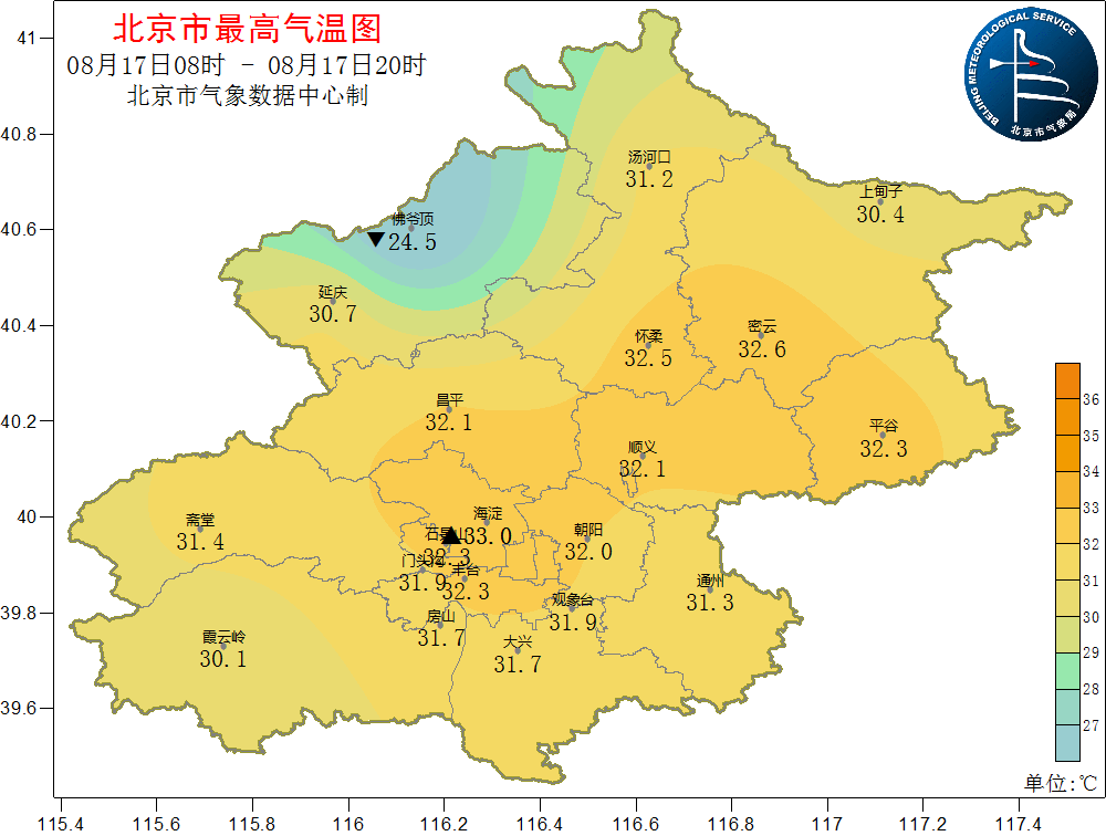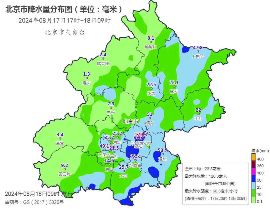 8月17日17时至18日9时降雨实况:全市平均降水量23.3毫米,城区平均35.8毫米。全市有58个站大于等于50毫米,最大降水出现在朝阳千亩湖公园120.3毫米;最大降水强度出现在通州于家务,17日23时-18日00时降水60.3毫米/小时。