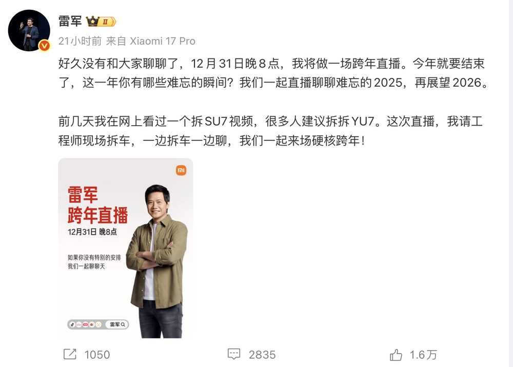 12月30日,小米创办人、董事长兼CEO雷军曾宣布,将于12月31日晚8点做一场跨年拆车直播。