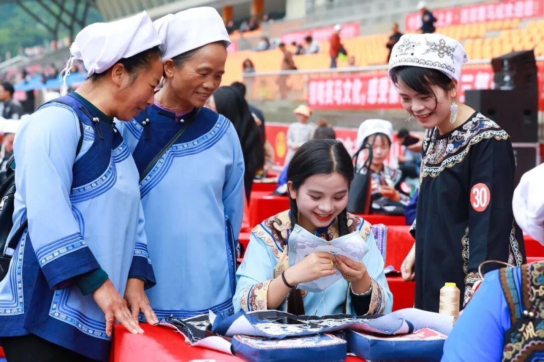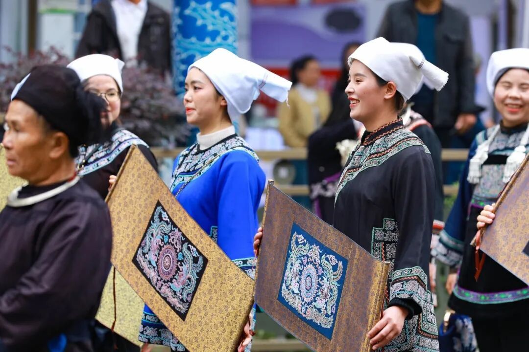 水族群众在踩街巡游活动上展示水族马尾绣作品。张恩鑫摄/光明图片