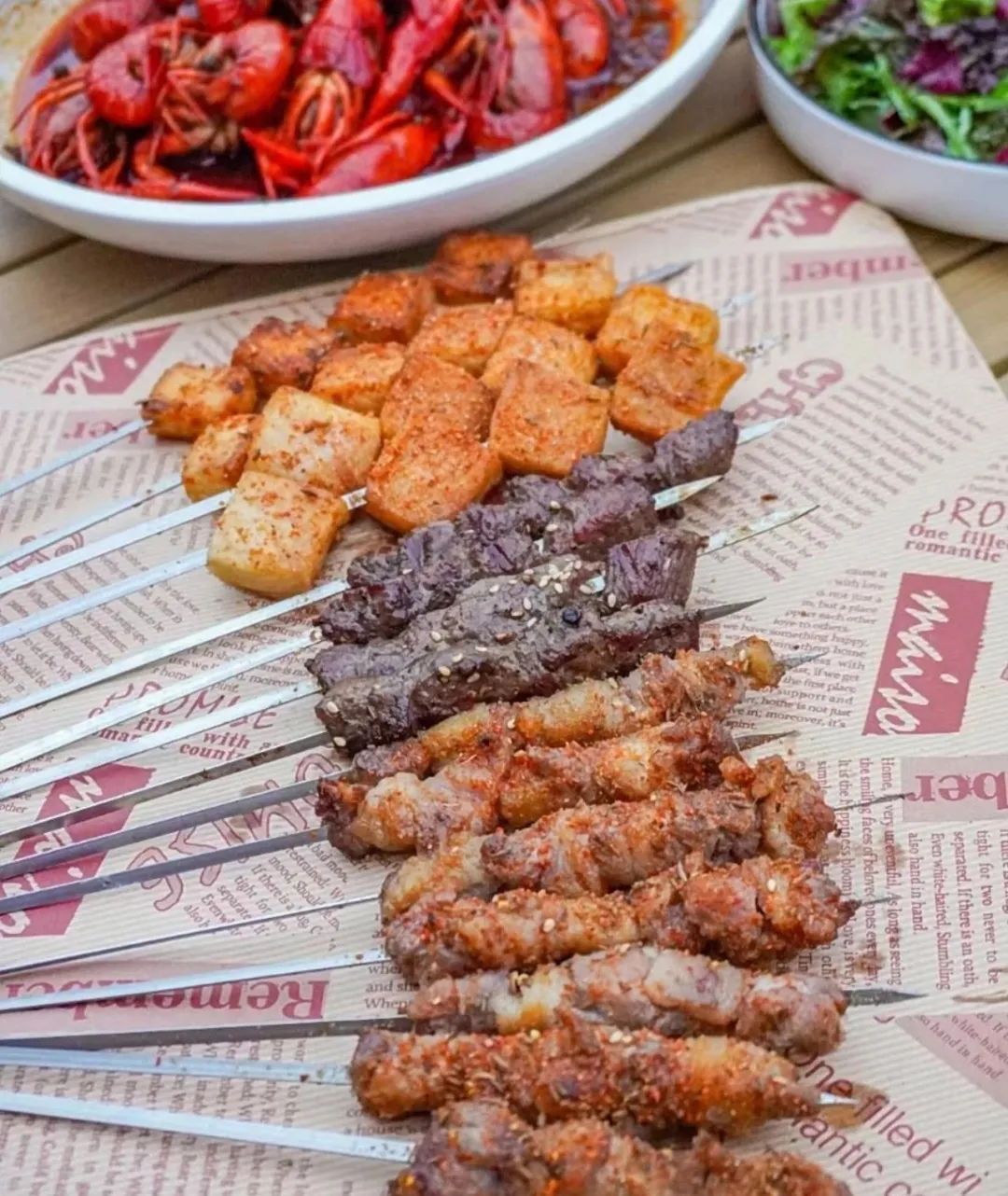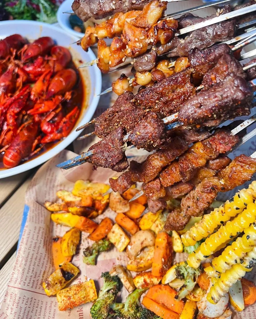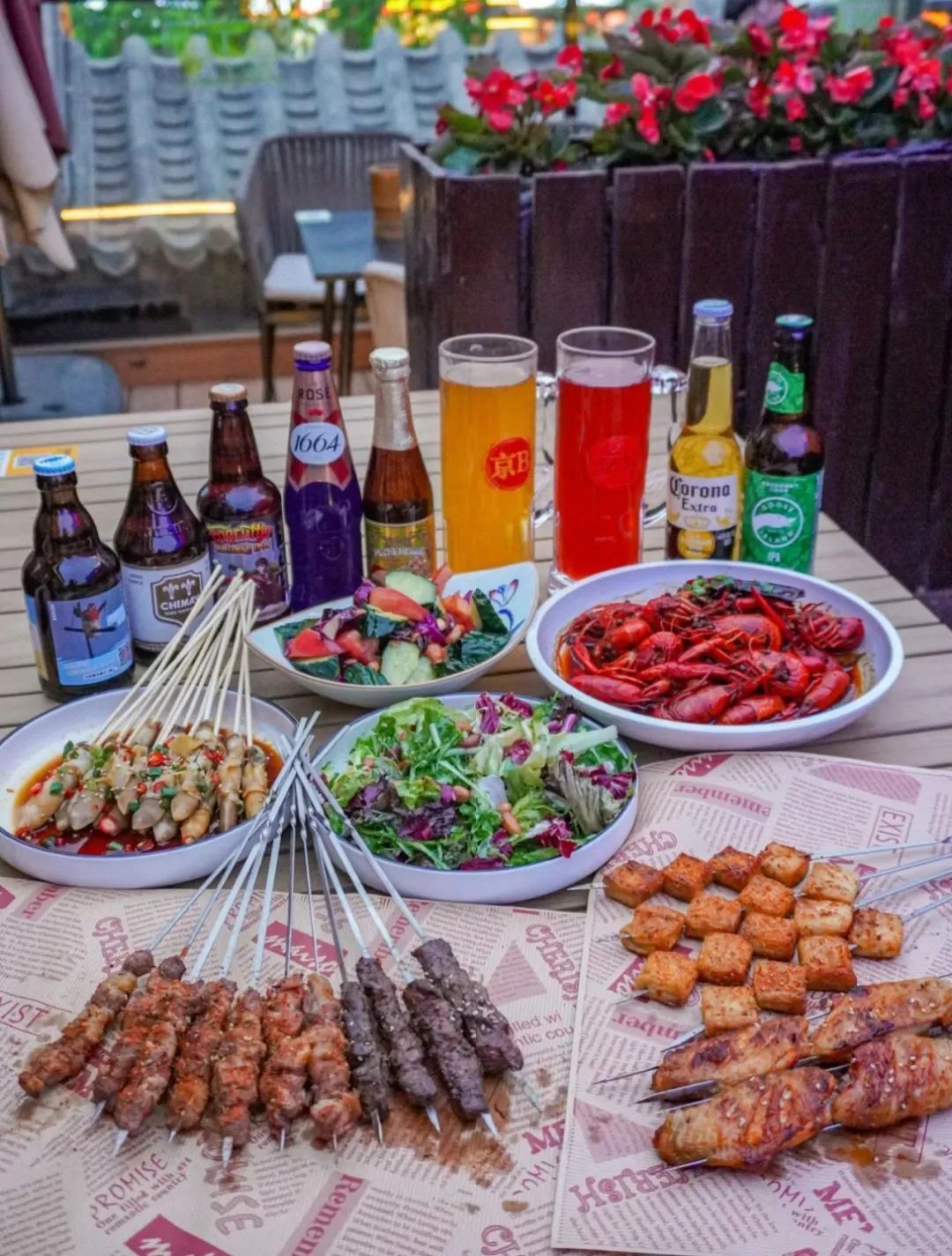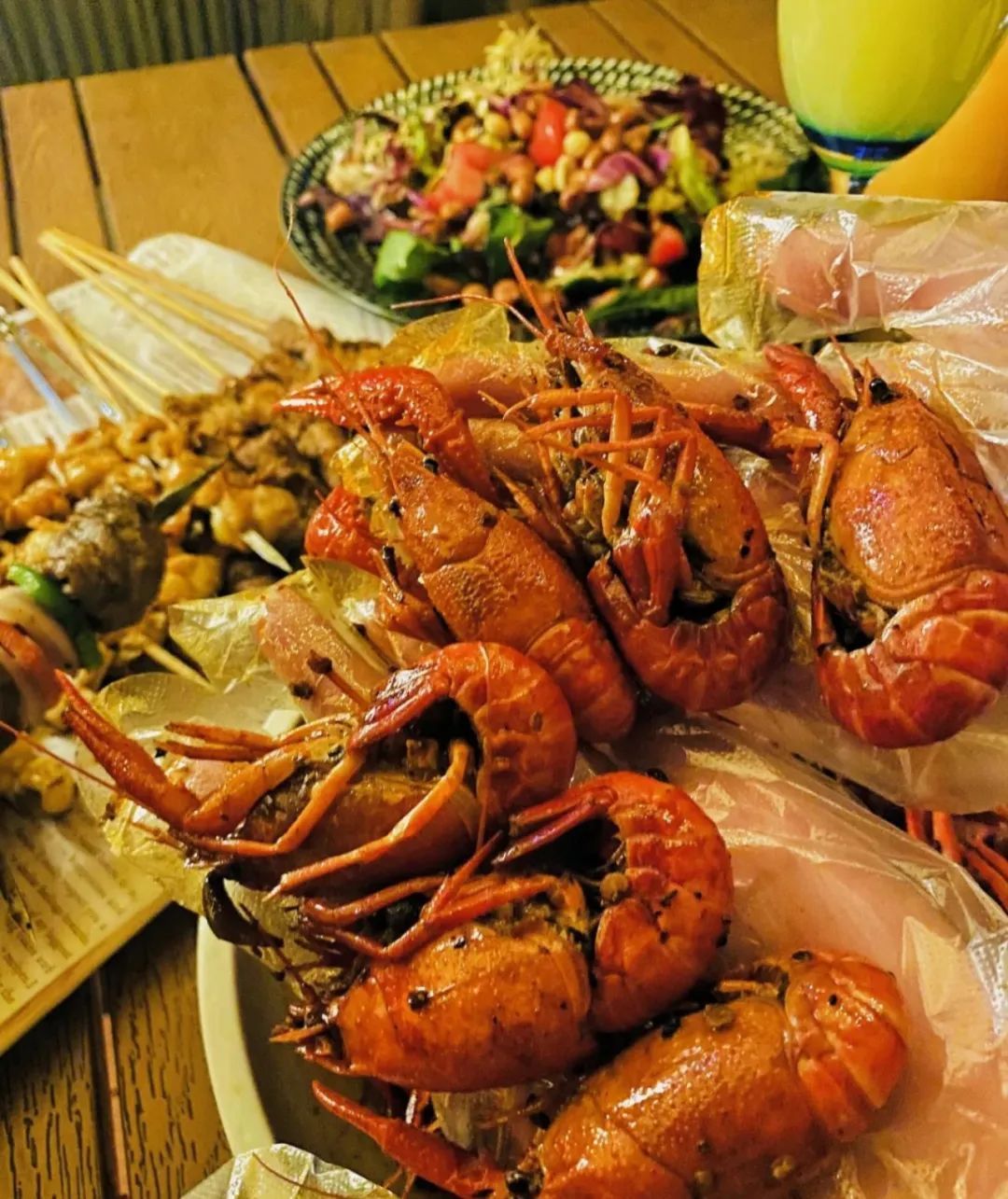 蒜蓉小龙虾、蜜汁鸡翅、精品羊腿肉串、烤羊排、秘制腌熏大鹅、捞汁小甜虾、百香果啤酒、鲜酿小麦啤酒