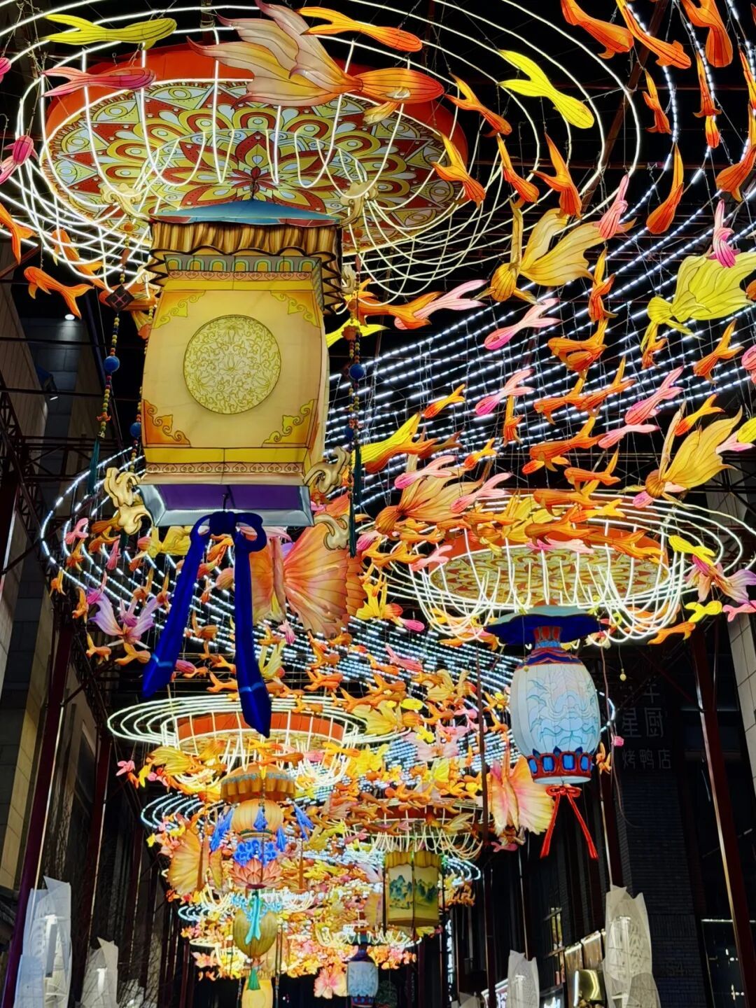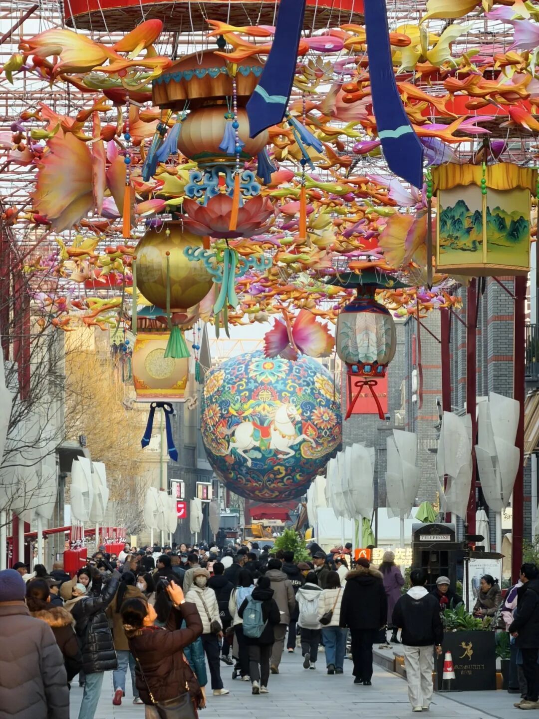 正月新春的暮色染蓝前门天际,廊房头条百米灯街惊艳点亮。7组藻井宫灯如繁星坠街,700条逐灯鱼群似流光穿梭,8.5米直径的"骐骥跃彩"大花球在胡同巷尾绽放,景泰蓝纹样包裹着腾跃的白马,与青砖灰瓦的胡同肌理相互映照,尽显繁华生机。现场市民游客们手机镜头里光影穿梭,刘女士感叹:“太震撼了,像在星空里穿行,还有万马奔腾的气势!”