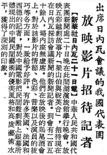 1954年的日内瓦会议期间,为了让外国记者更好地了解新中国,周恩来总理让代表团举行电影招待会,放映的就是这部影片。周总理还让负责新闻办公室工作的熊向晖在请柬上只写一句话,“请你欣赏一部彩色歌剧电影——中国的《罗密欧与朱丽叶》”。(2023年10月17日《北京日报》9版,《音乐大使》)当晚的电影招待会座无虚席,观众们“入戏太深”,散场后仍不舍离去。在放映后的鸡尾酒会上,许多英国、法国和西德的记者都表示,中国电影把民间戏剧搬上银幕所体现出的中国民间艺术的优美风格和高度艺术水平,令人印象深刻。(1954年5月22日《北京日报》1版,《出席日内瓦会议的我国代表团放映影片招待记者》)十多天后,当有记者向世界著名电影导演、演员查尔斯·卓别林提起这部戏曲电影时,他也表示很想看看中国制出的这种影片。(1954年6月6日《北京日报》4版,《卓别林访问记》)