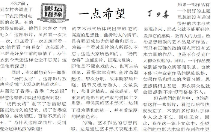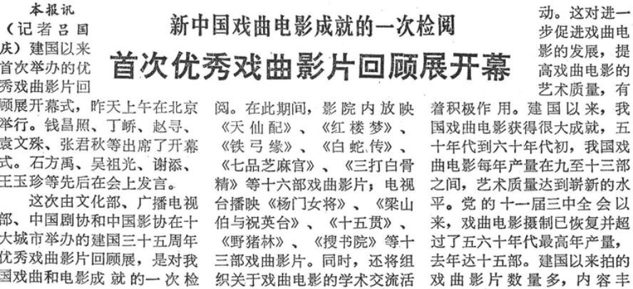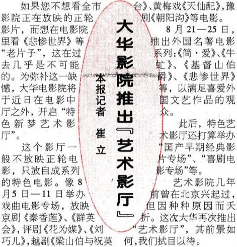上世纪90年代,随着戏曲电视剧的兴起和电影市场的低迷,戏曲电影进入了发展平台期。针对这一现象,在本报1992年组织的繁荣首都舞台大家谈征文中,有读者提出应举办影片汇映活动培养新一代观众,让人们可以在影院随时欣赏中国的艺术瑰宝。(1992年7月3日《北京日报》7版,《应重视培养京剧观众》)1996年,北京大华影院推出“艺术影厅”,只放自成系列的特色电影,如戏曲电影专场。观众在这里能欣赏到京剧《秦香莲》《群英会》,评剧《花为媒》《刘巧儿》,越剧《梁山伯与祝英台》,黄梅戏《天仙配》,豫剧《朝阳沟》等许多经典戏曲电影。(1996年8月2日《北京日报》5版,《大华影院推出“艺术影厅”》)