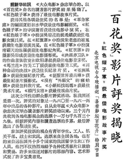 1961年底,为促进电影艺术创作的百花齐放,《大众电影》杂志在北京创办“百花奖”。这种全国性的群众影片评奖活动,当时在我国还是第一次。“百花奖”的设置,其中就包括最佳戏曲片奖。(1961年11月8日《北京日报》2版,《“大众电影”将举办影片评奖》)