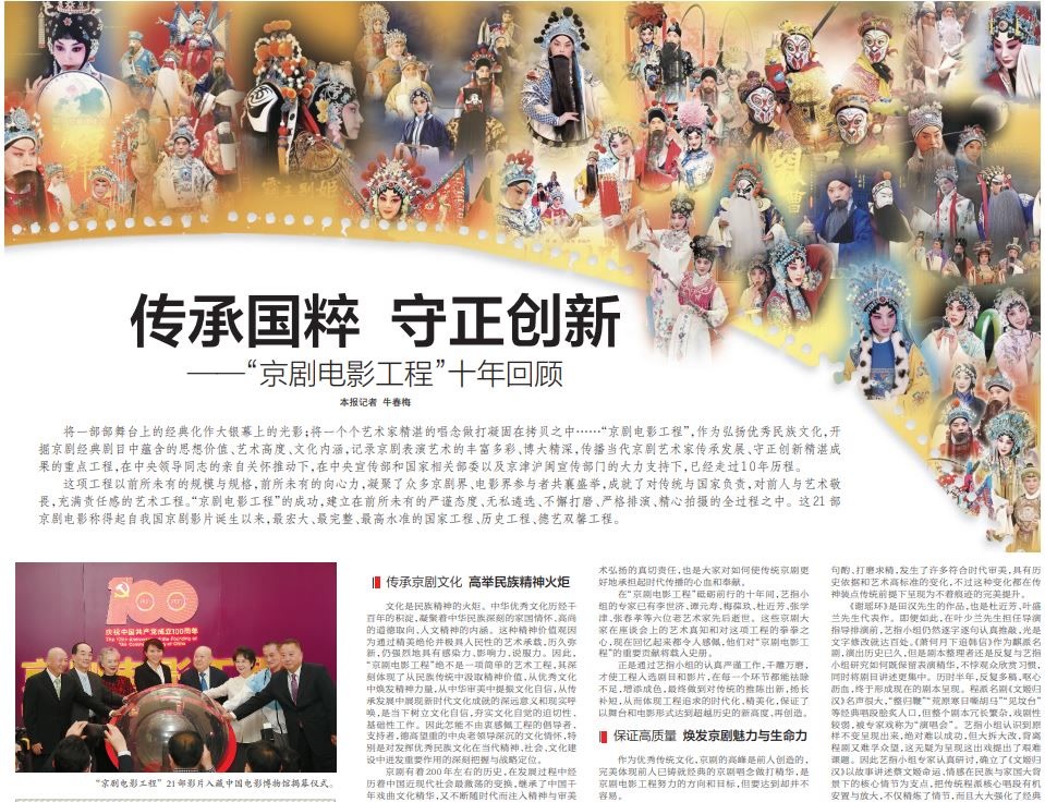 2015年,京剧电影《状元媒》获中美电影节年度最佳戏曲电影奖,《霸王别姬》(3D版)在美国获2015创意艺术奖·金卢米埃尔奖。《霸王别姬》还是第一部在举行奥斯卡颁奖典礼的好莱坞杜比剧院举行首映式的中国电影,杜比公司执行副总裁安迪特意带13岁的儿子一同观看:“这是非常棒的电影,艺术表现力令人印象深刻,让我在第一时间感受到京剧和中国文化的魅力。”(2016年4月14日《北京日报》1版,《弘扬国粹有新招 京剧电影驻场放》)《龙凤呈祥》《秦香莲》《萧何月下追韩信》《贞观盛事》《捉放曹》……截至2021年,京剧电影工程已摄制完成21部京剧经典影片,其中多部获国际大奖,为中国电影饮誉世界贡献力量。(2021年7月15日《北京日报》7版,《传承国粹 守正创新》)