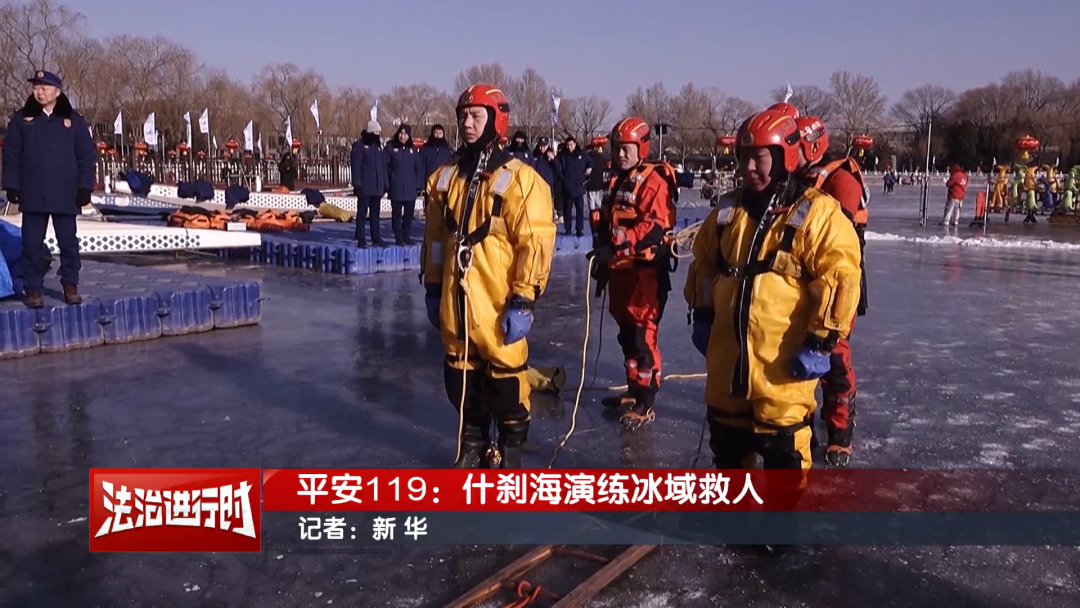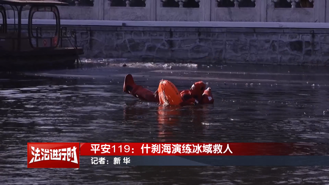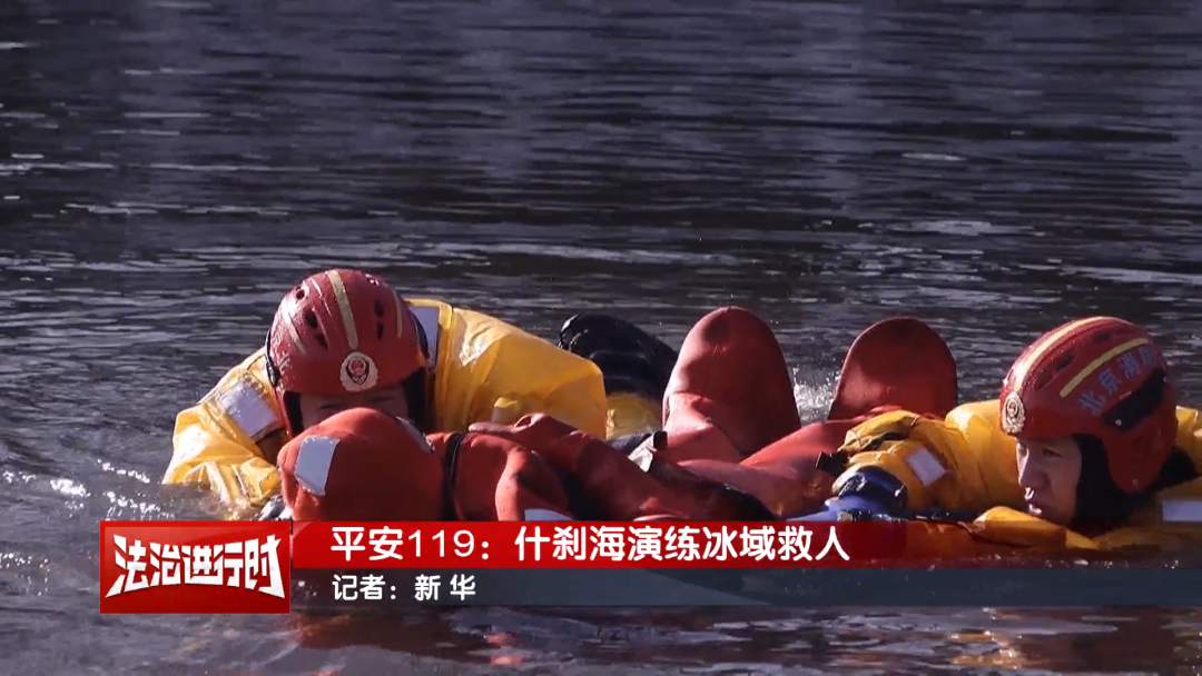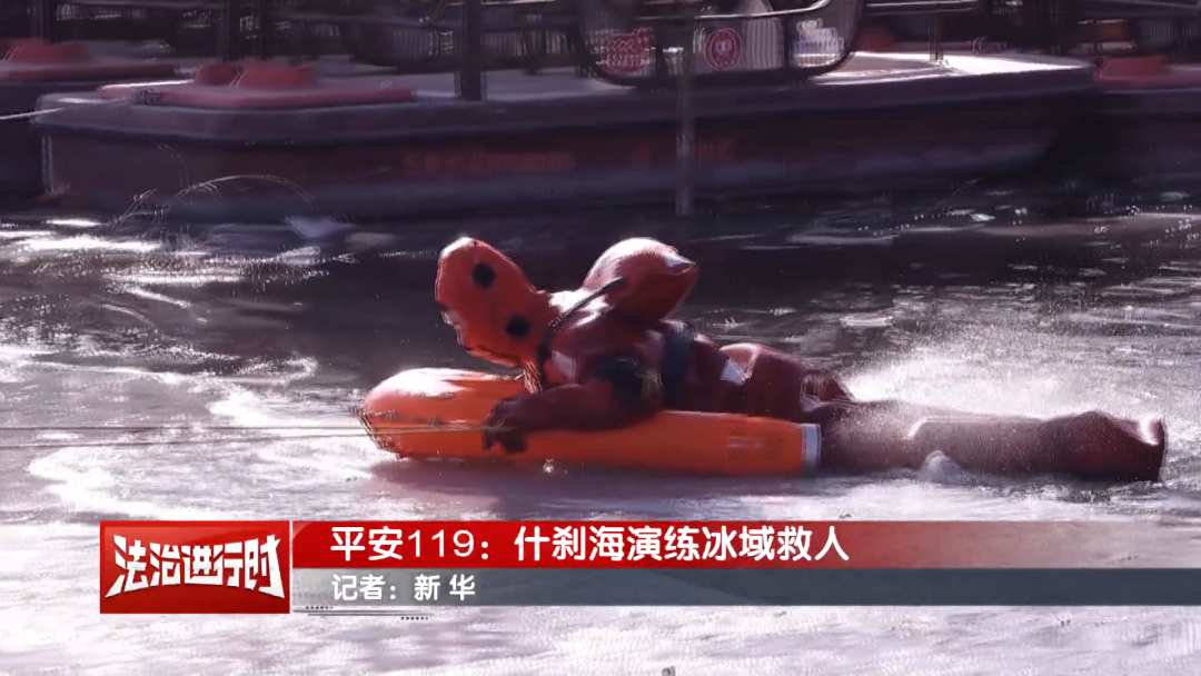 近日,北京户外气温在零下10摄氏度,在什刹海冰场护栏外冰面上,西城区消防救援支队消防员上演了一场应急救援实战演练。