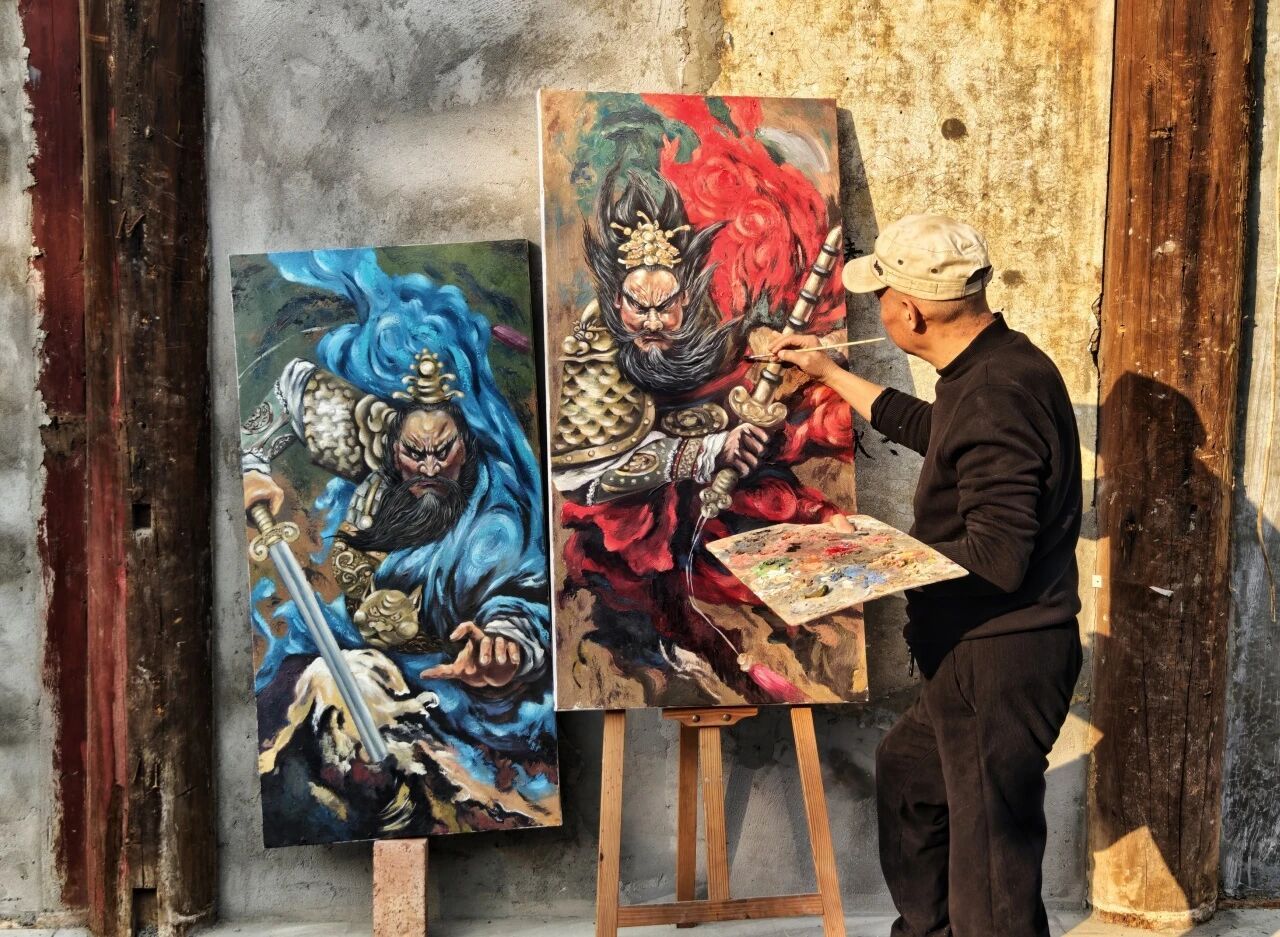 1月8日,“阆中门神画”传承人张桅在阆中古城门神画展示中心,创作油画版门神画迎马年新春。梁德 摄