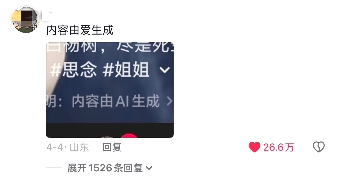 近日,在短视频平台,话题“这些视频由爱生成”登上热搜榜。起因是有博主借助最新AI视频技术,逼真重现网友逝去亲人的音容笑貌,而视频下方所标注的作者声明“内容由AI生成”,被网友引申为“内容由爱生成”,成为点赞量超26万的“神评”。