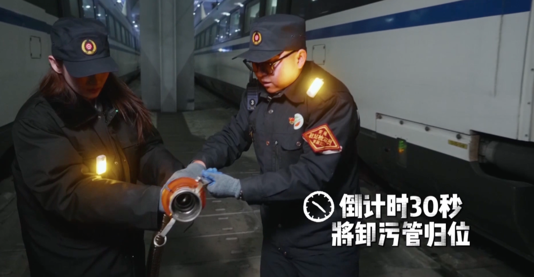 在列车的短暂停靠期间,工作人员快速将卸污管对准排污口,通过负压将污物抽至窖井内,确保列车集便器在乘客下次使用前处于清洁状态。
