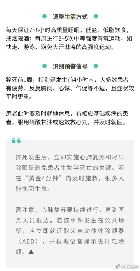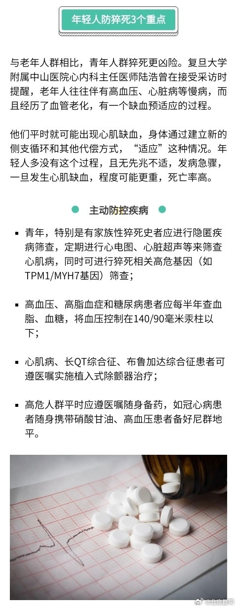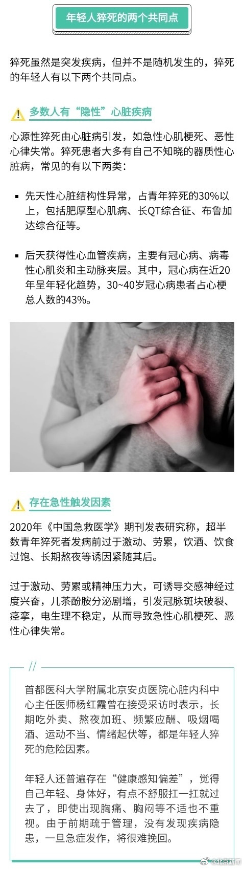 【#年轻人猝死大多有两个共同点#】《中国心源性猝死流行病学调查》显示,我国每年心源性猝死人数约55万,18~35岁人群占比从2015年的12%,飙升到2024年的28%。中南大学湘雅医院心血管内科主任医师余国龙表示,猝死事件具有突发性和不可预测性,抢救窗口极短。在我国,每10秒约有1人死于猝死,其中90%以上发生在医院外;40岁以下人群占总猝死人数约40%。 猝死虽然是突发疾病,但并不是随机发生的,猝死的年轻人有以下两个共同点。 1、多数人有“隐性”心脏疾病:心源性猝死由心脏病引发,如急性心肌梗死、恶性心律失常。猝死患者大多有自己不知晓的器质性心脏病。 2、存在急性触发因素:2020年《中国急救医学》期刊发表研究称,超半数青年猝死者发病前过于激动、劳累,饮酒、饮食过饱、长期熬夜等诱因紧随其后。 年轻人还普遍存在“健康感知偏差”,觉得自己年轻、身体好,有点不舒服扛一扛就过去了,即使出现胸痛、胸闷等不适也不重视。由于前期疏于管理,没有发现疾病隐患,一旦急症发作,将很难挽回。