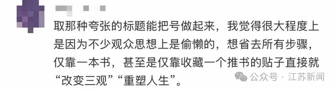网友“一个星期后雨仍未停”说,可以理解这类读书博主账号的诞生,抓住了被短视频带来的焦躁和生活中的疲惫——很多人想要阅读,但都不愿意费心思去思考“我该怎么读”“什么最适合我读”,寻求高流量、高变现的“标题党”伪读书博主应运而生。