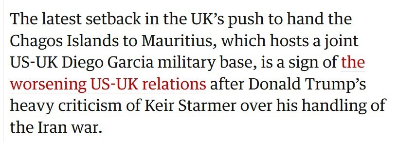 对于英国计划将查戈斯群岛移交毛里求斯所遭遇的挫折,英国《卫报》表示,这是美国总统特朗普就对伊朗战事严厉指责英国首相斯塔默后,美英关系继续恶化的信号。
