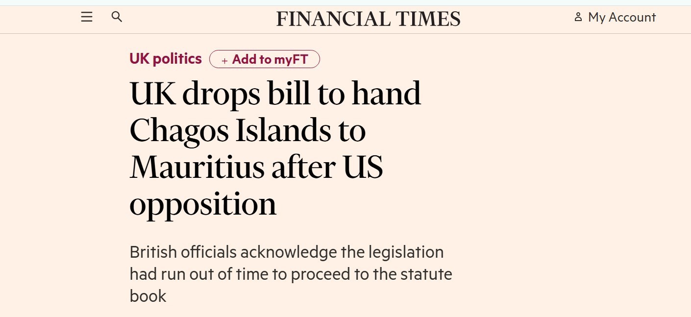 据英国《金融时报》披露,英国政府已放弃在本届议会会期内寻求通过将查戈斯群岛主权移交给毛里求斯的相关法案,美国没有落实关键步骤是重要原因。