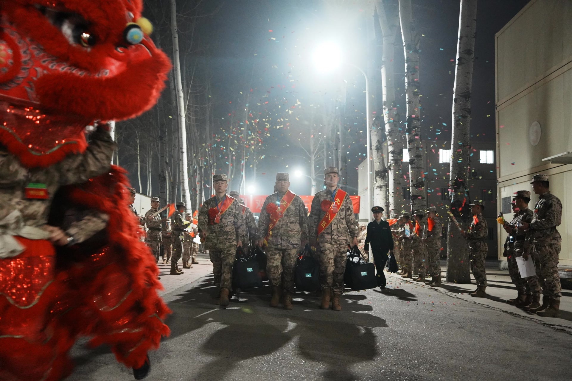 在奔赴军营的途中,新兵们或与家人分享旅途喜悦,或相互鼓劲打气,脸上洋溢着对军旅生活的憧憬与自豪。抵达营区时,锣鼓喧天,醒狮欢腾,彩纸纷飞。老兵们高举“热烈欢迎新战友”的横幅,以最热烈的仪式迎接新战友的到来,让初入军营的新兵们感受到家一般的温暖。