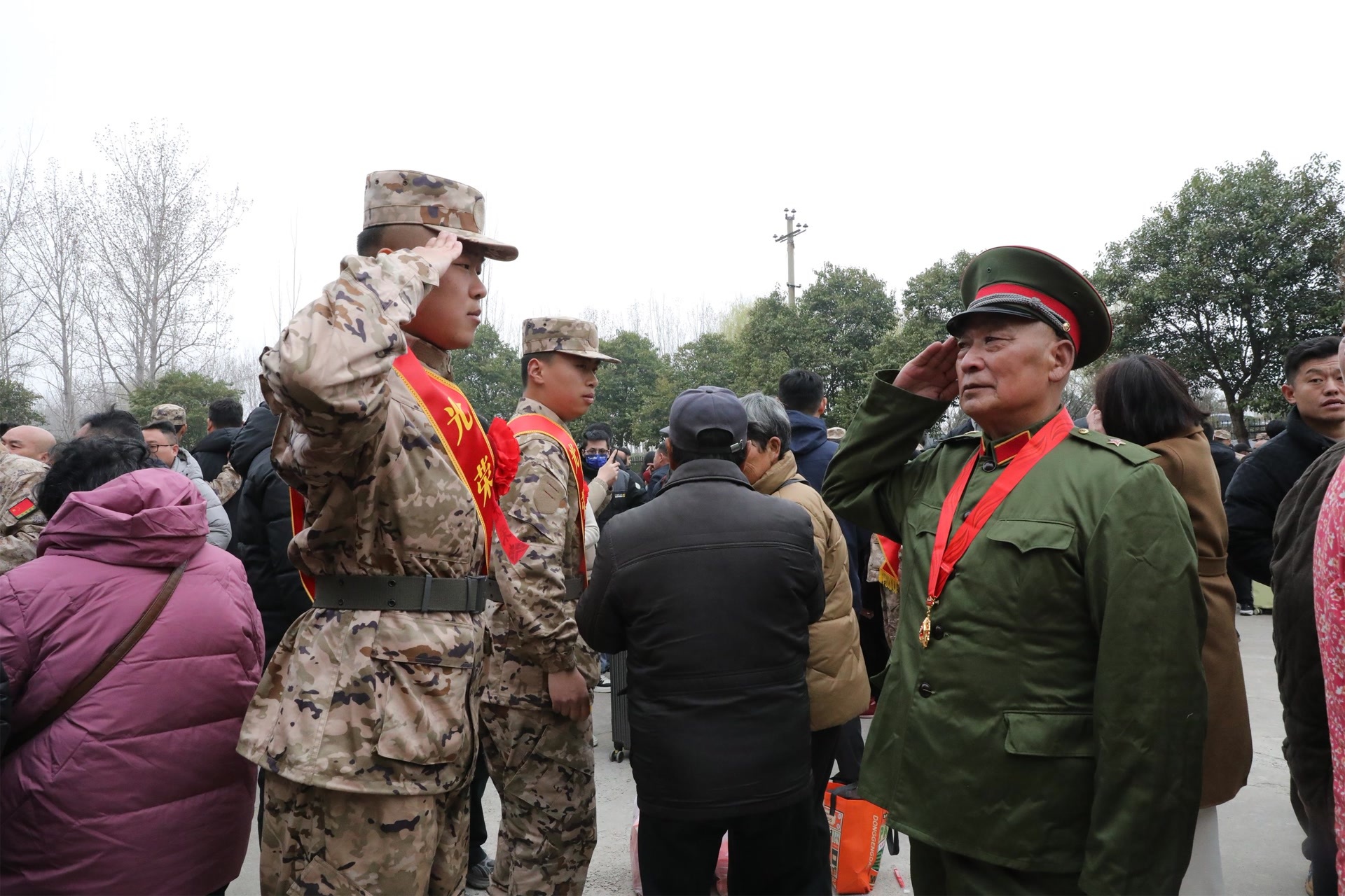 在江苏沛县的新兵欢送仪式现场,77 岁老兵陈敬福身着珍藏多年的老式军装,为即将入伍的孙子陈航亚送行。陈敬福紧紧握住孙子的手,再三叮嘱,要听党指挥、苦练本领,安心服役、报效国家。一句句嘱托,饱含着老兵对家国的忠诚与对后辈的期望。“我和我爷爷是战友了。”陈航亚郑重承诺,一定不负爷爷、不负家乡,在军营建功立业。一位身着老式军装的老兵与新兵相互敬礼,两代军人的传承瞬间定格,成为现场最动人的画面,彰显着爱国情怀的代代相传。