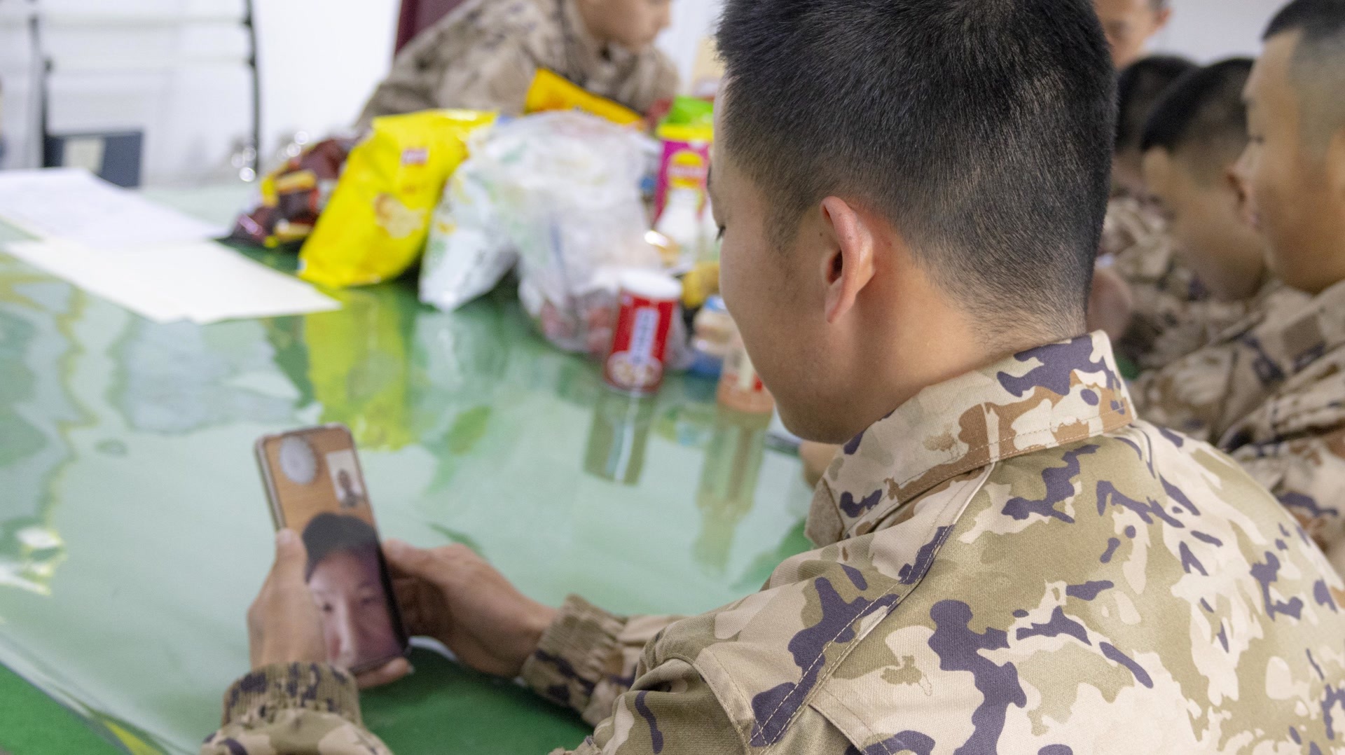 走进班排宿舍,新兵们放下行囊后的第一件事,就是给远方的亲人报平安。连队专门安排时间,让每名新兵都能给家里打一通视频电话。