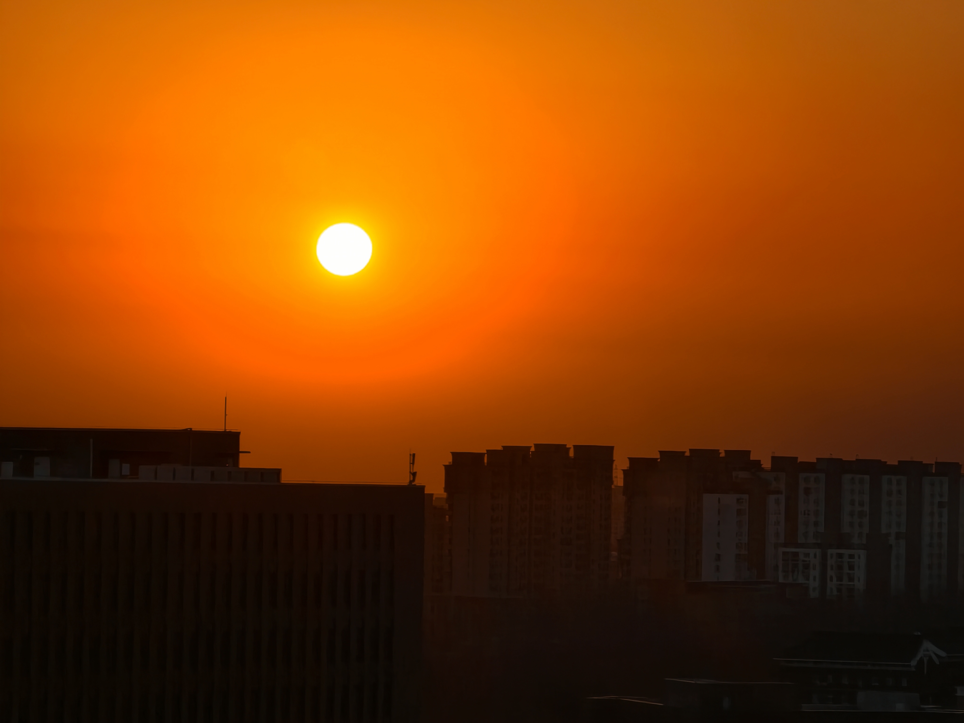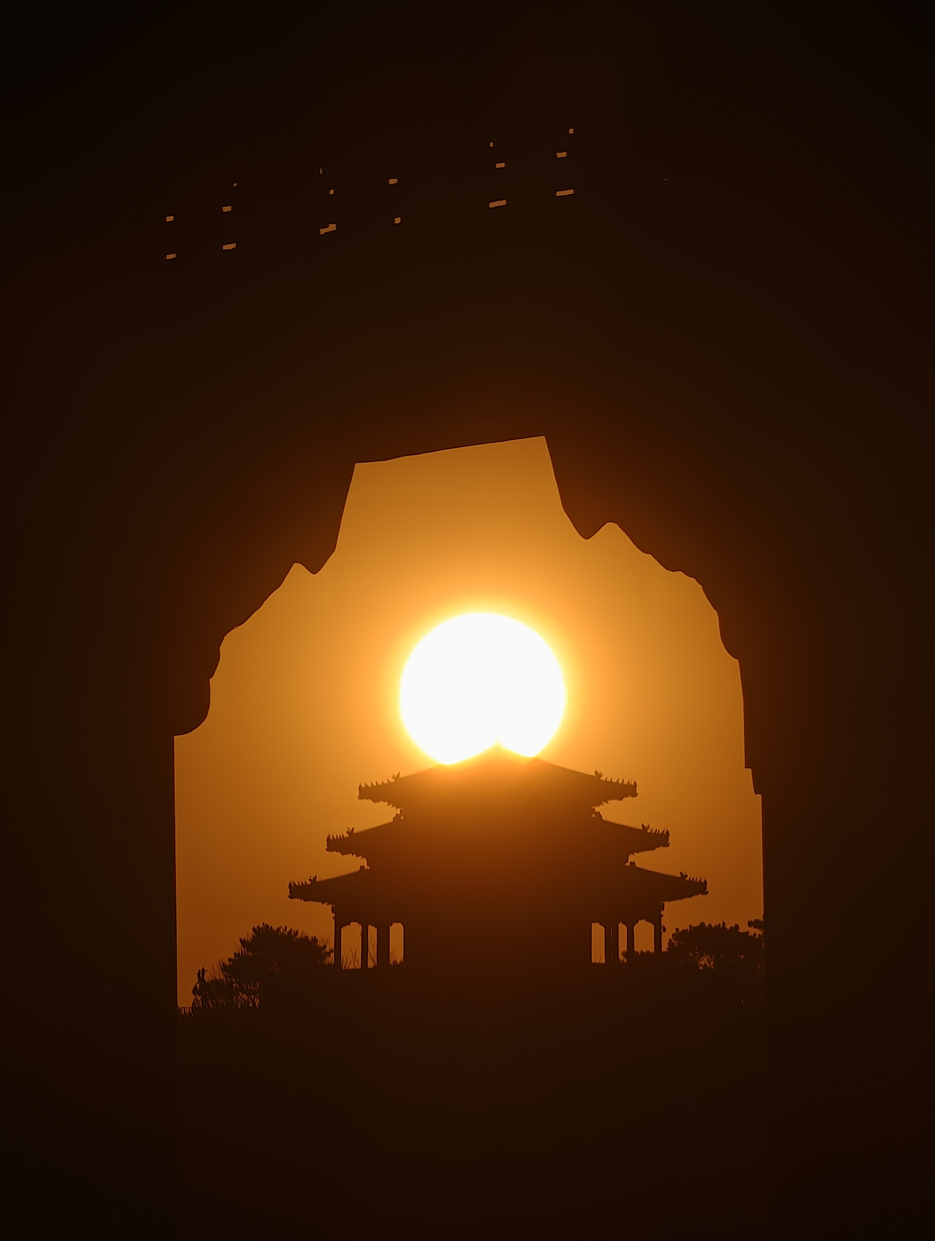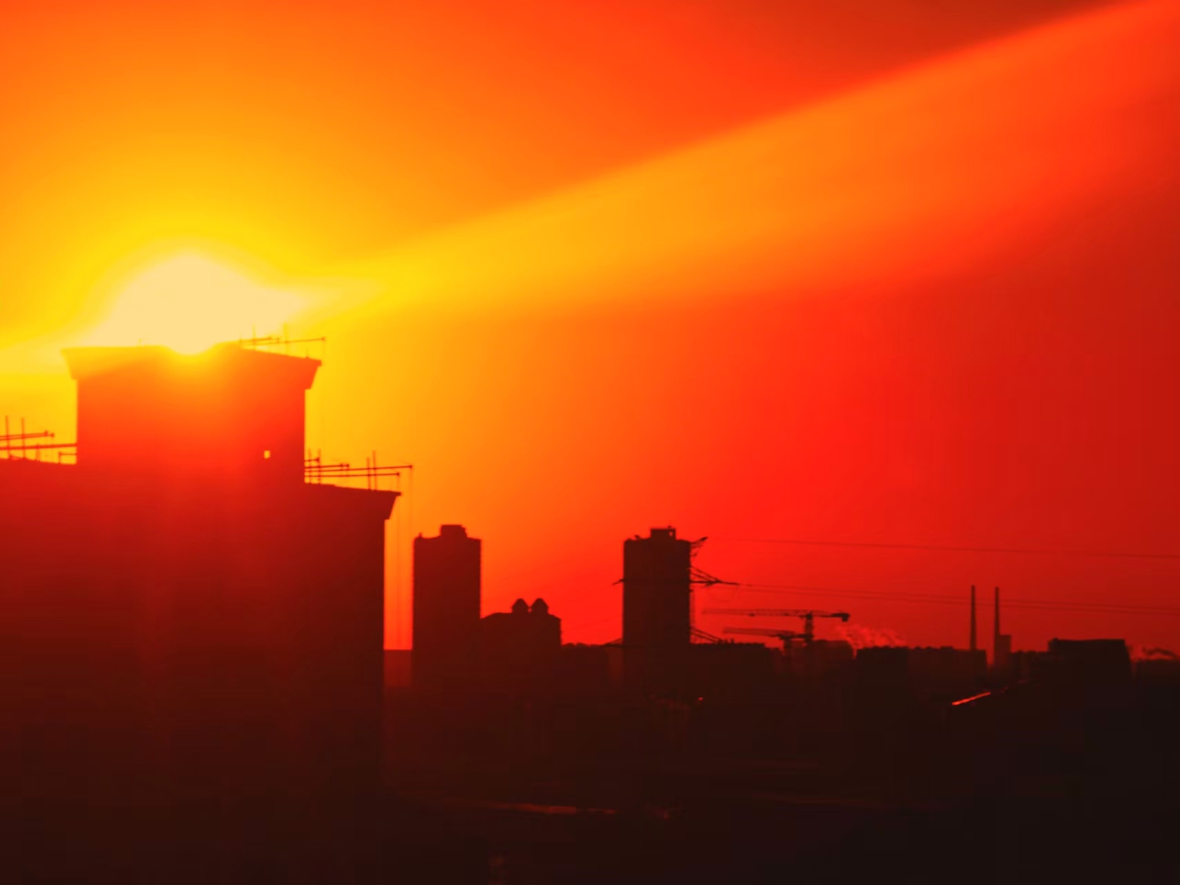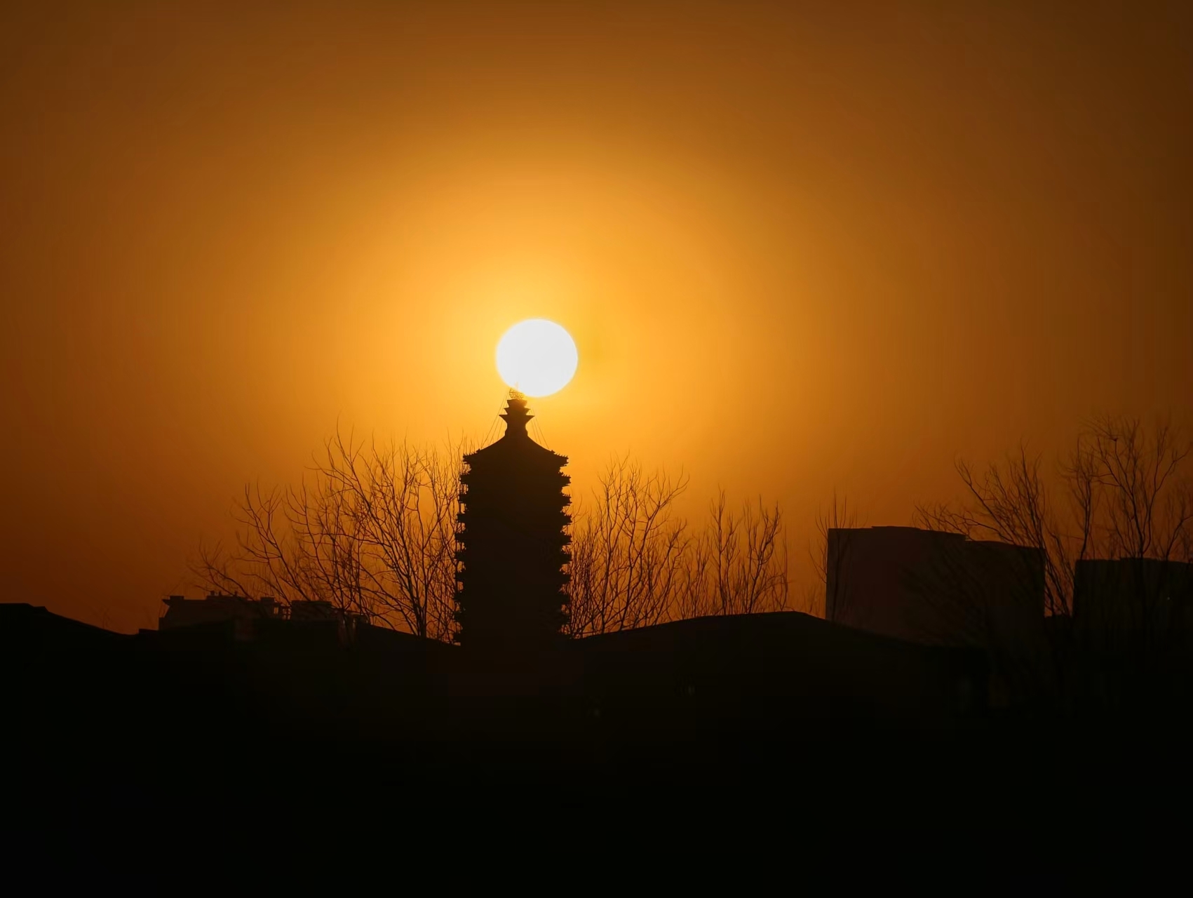 京寒欲至,苇间落日映古建。