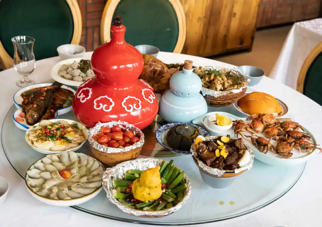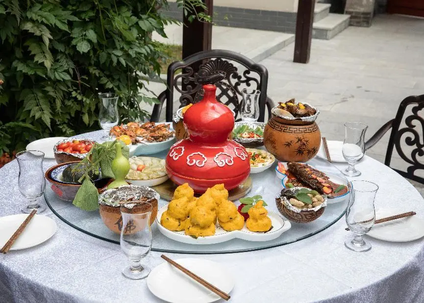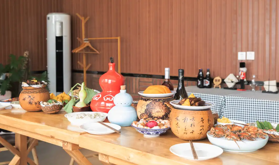 宴席间摆放三俩个绿色葫芦,和气致祥。菜品器皿采用自有的葫芦艺术品加以创意文化特色,形成独一无二的特色风格。