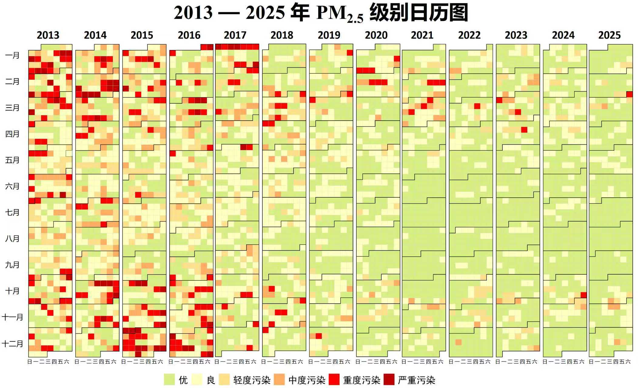 2013年至2025年PM2.5级别日历图。
