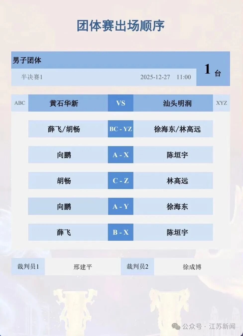南京青奥体育公园体育馆今天打响男团半决赛焦点战,全天共两场对决,开赛时间分别为11:00与19:00。率先登场的首场较量由黄石华新迎战汕头明润,本场团体赛出场顺序如下: