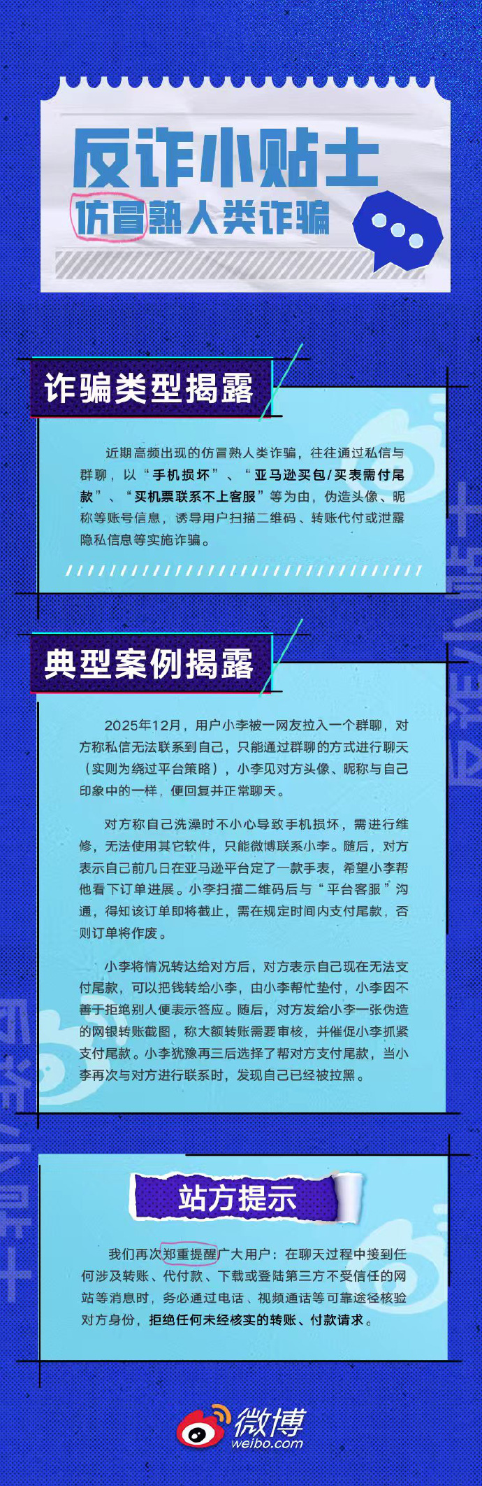 微博一直致力于营造安全、文明、诚信的社区环境,始终对各类诈骗行为保持零容忍态度并予以坚决打击,同时积极引导用户提高警惕、谨防被骗。近期,鉴于“仿冒熟人类”诈骗案件高发,站方持续升级识别拦截和惩治力度,2025年7月以来,已处置此类涉诈账号超293万个。
