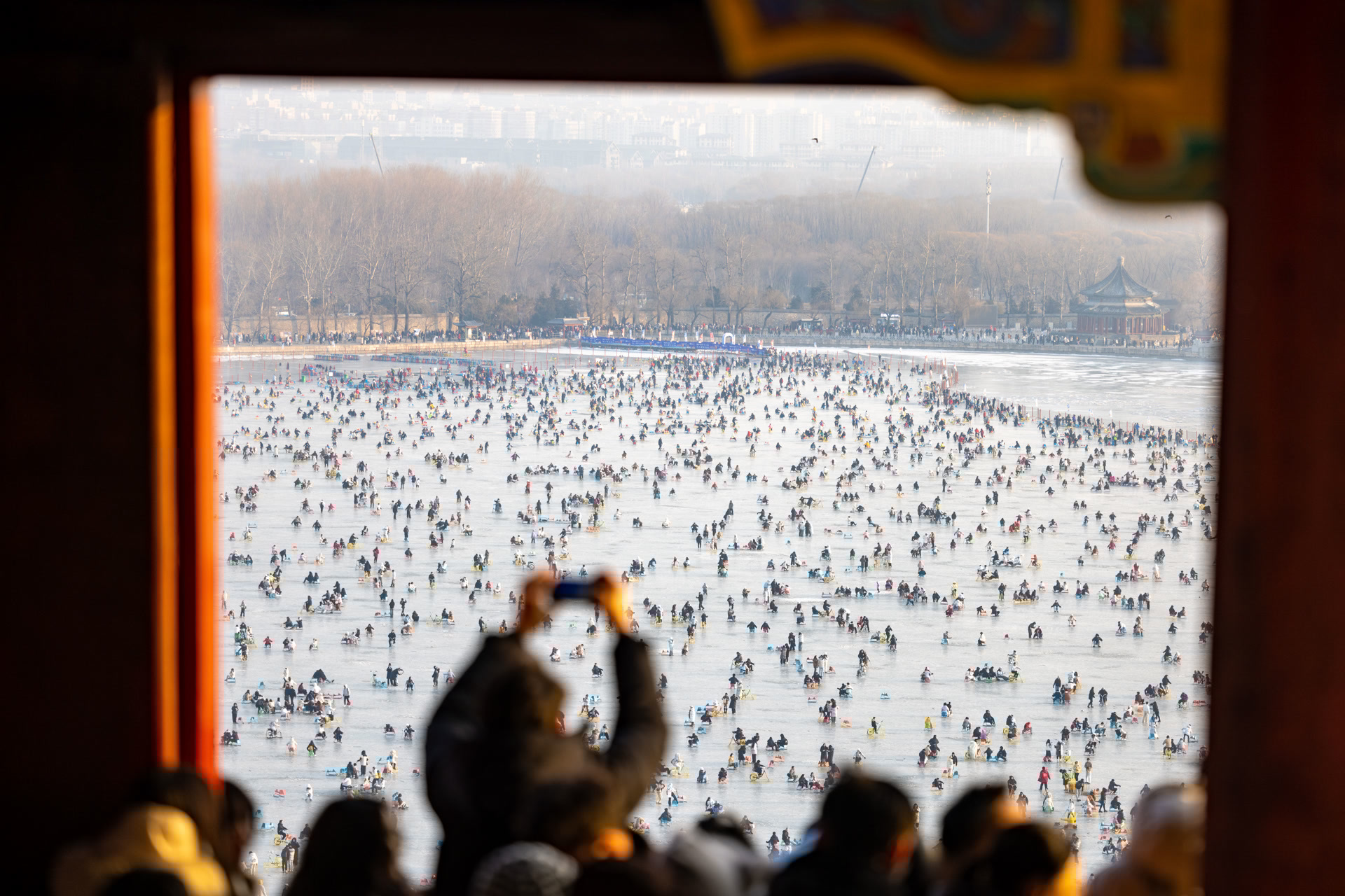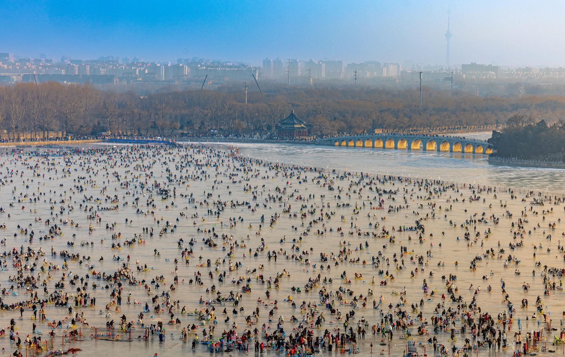 在颐和园的冰面上,与陌生人自发组队的冰车接龙,成了当下超火的冬日社交新方式。