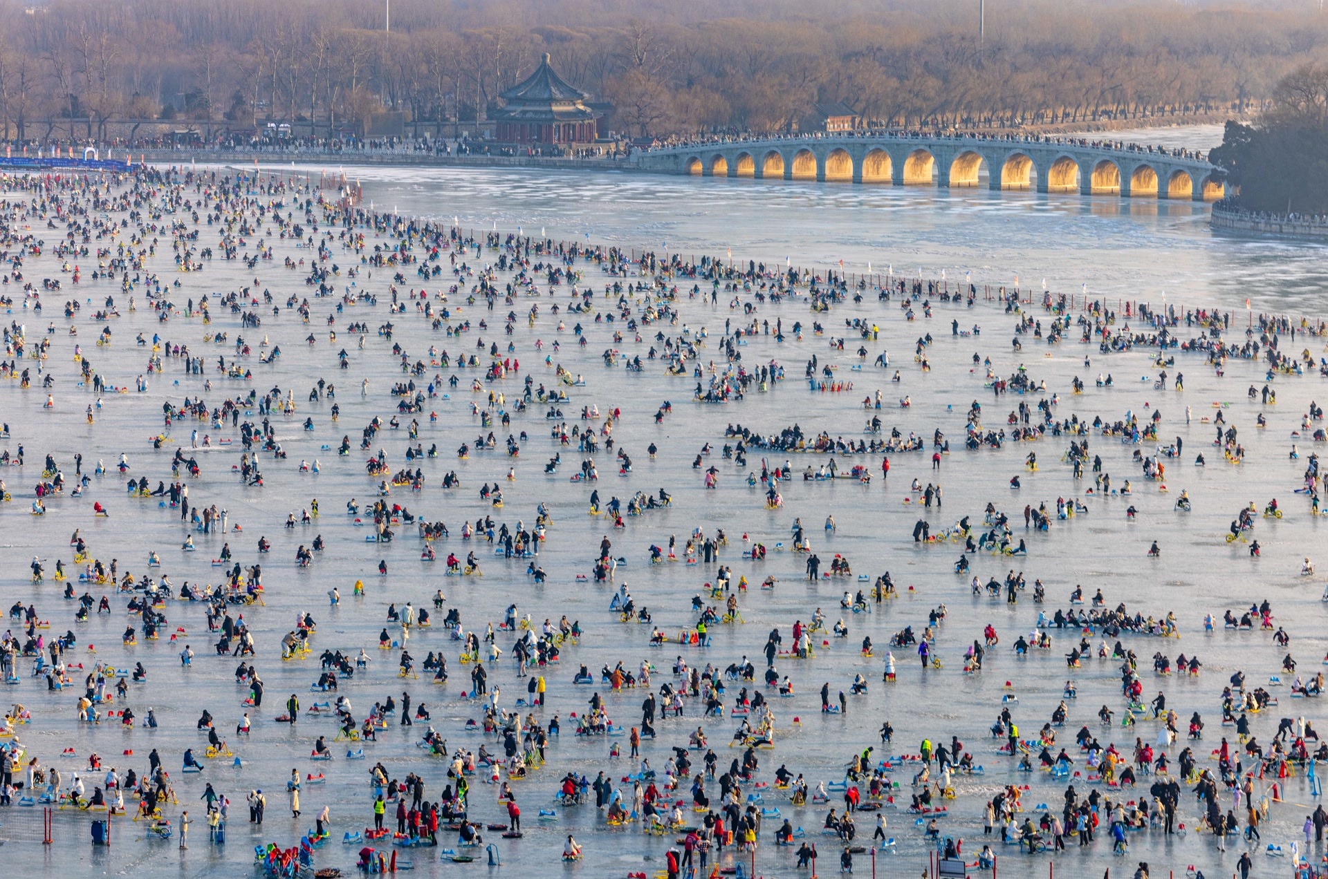 作为北京规模最大的天然户外冰场,16万平方米的昆明湖冰场最受关注。从上午开始,知春亭码头前就排起长队,即便公园因冰面瞬时承载量有限实行限流措施,也挡不住大家的热情。从万寿山高处望去,广阔的冰面上人头攒动、热闹非凡,色彩明快的单人冰车、双人冰车与冰上自行车往来穿梭,欢快的笑声与游客的呼喊声交织在一起,为皇家园林注入了蓬勃的冬日活力。网友直呼:“这才是北京冬天的硬核浪漫!”