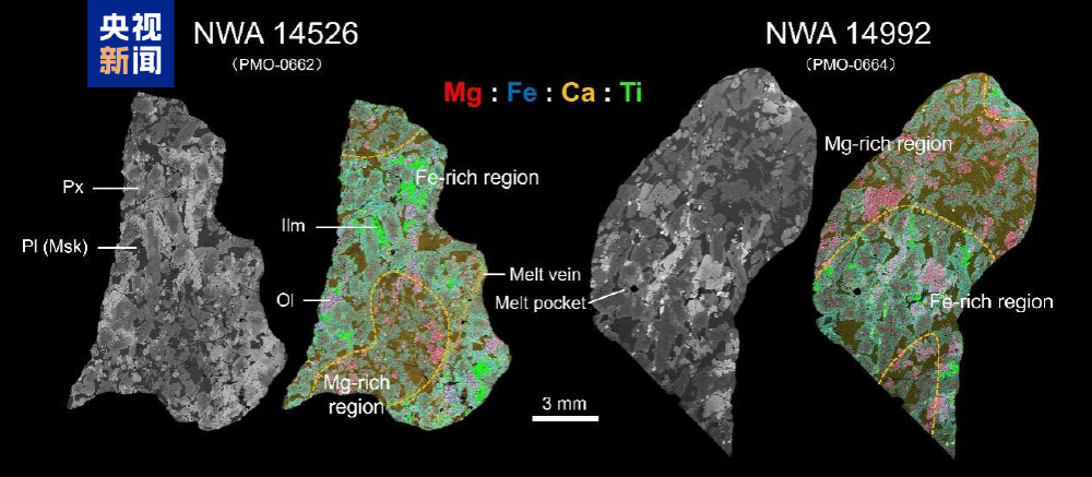 年轻的月海玄武岩是研究月球晚期火山活动的关键对象,科学界一般认为,自月球形成以来,其内部的玄武岩岩浆活动以简单结晶为主,缺乏类似地球岩浆房常见的动态过程。研究团队利用扫描电镜、电子探针等分析技术,对两块发现于2021年的月球陨石NWA 14526和NWA 14992开展了详细研究。