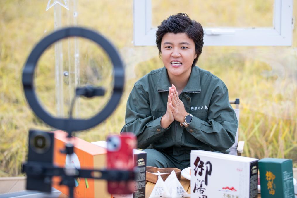 在黑龙江宁安市上官地村,陈雨佳在进行直播。新华社记者 张涛 摄