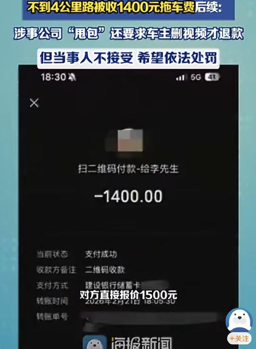 锐评|不到4公里收1400元,前倨后恭的拖车公司在心虚什么?_北京时间