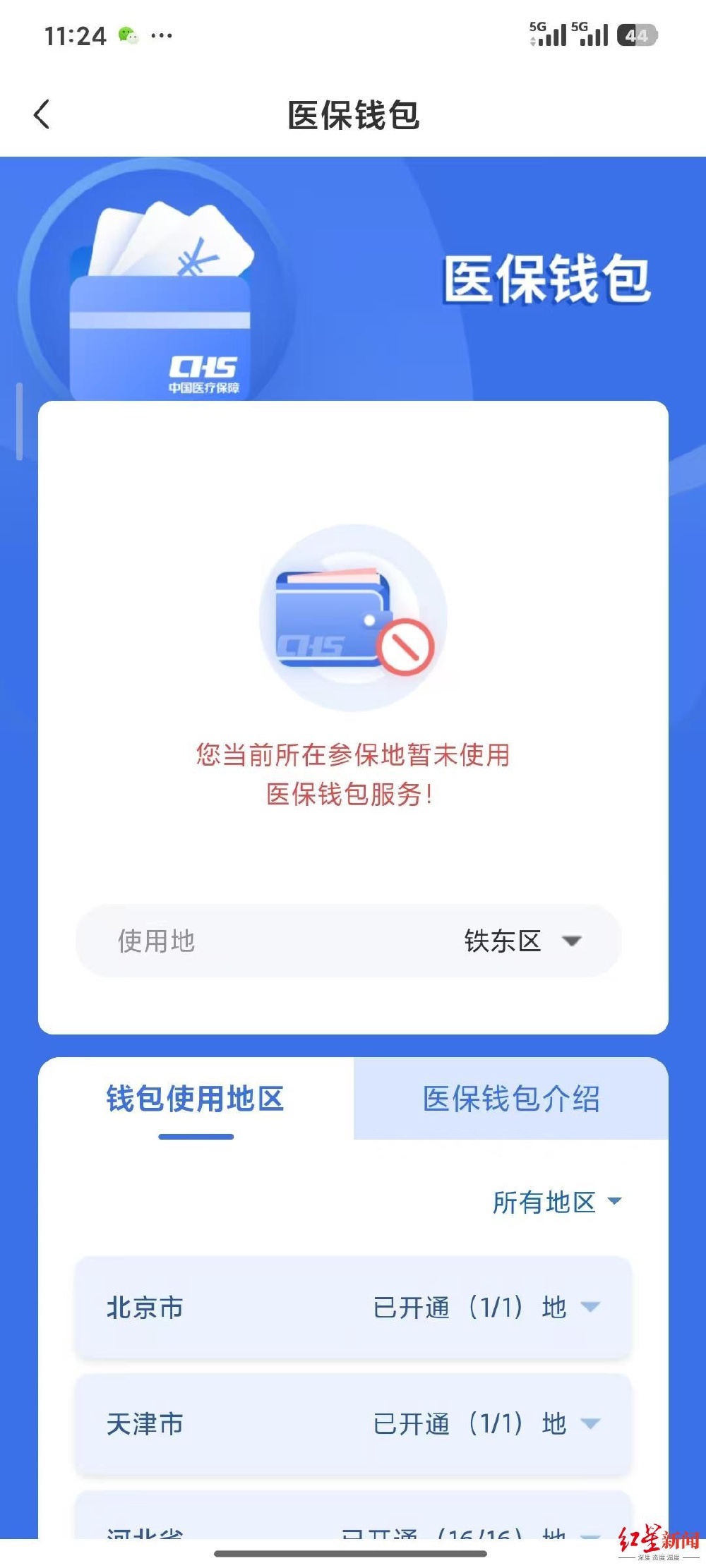 在辽宁鞍山参保的记者父亲进入“医保钱包”后,界面显示“您当前所在的参保地暂时未使用医保钱包服务”,尚不能领取这100元的共济。