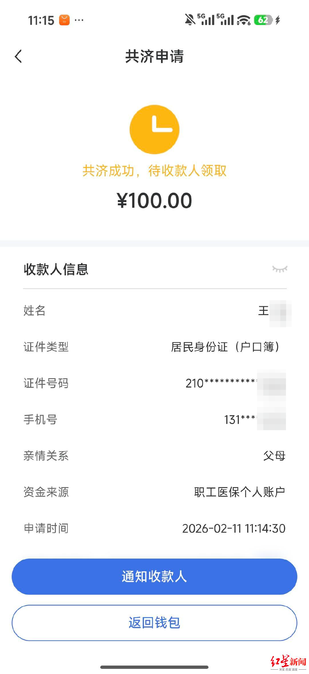 2月11日,红星新闻记者实测医保个人账户跨省共济操作。据北京日报等媒体公开信息,医保个人账户跨省共济需通过医保钱包实现。医保钱包是医保部门为参保人开通的资金账户,与个人医保码相关联。