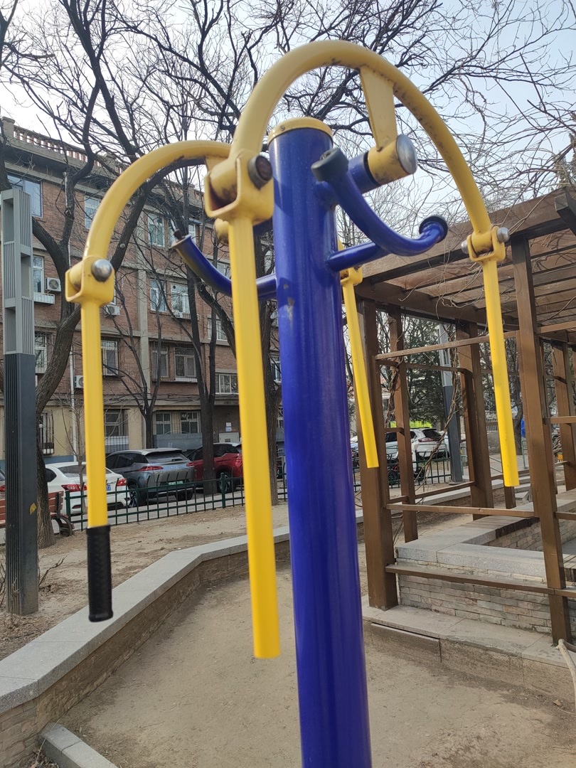 万源西里小区老式的黄蓝涂色健身器材,渐渐无法适应老年人的需求