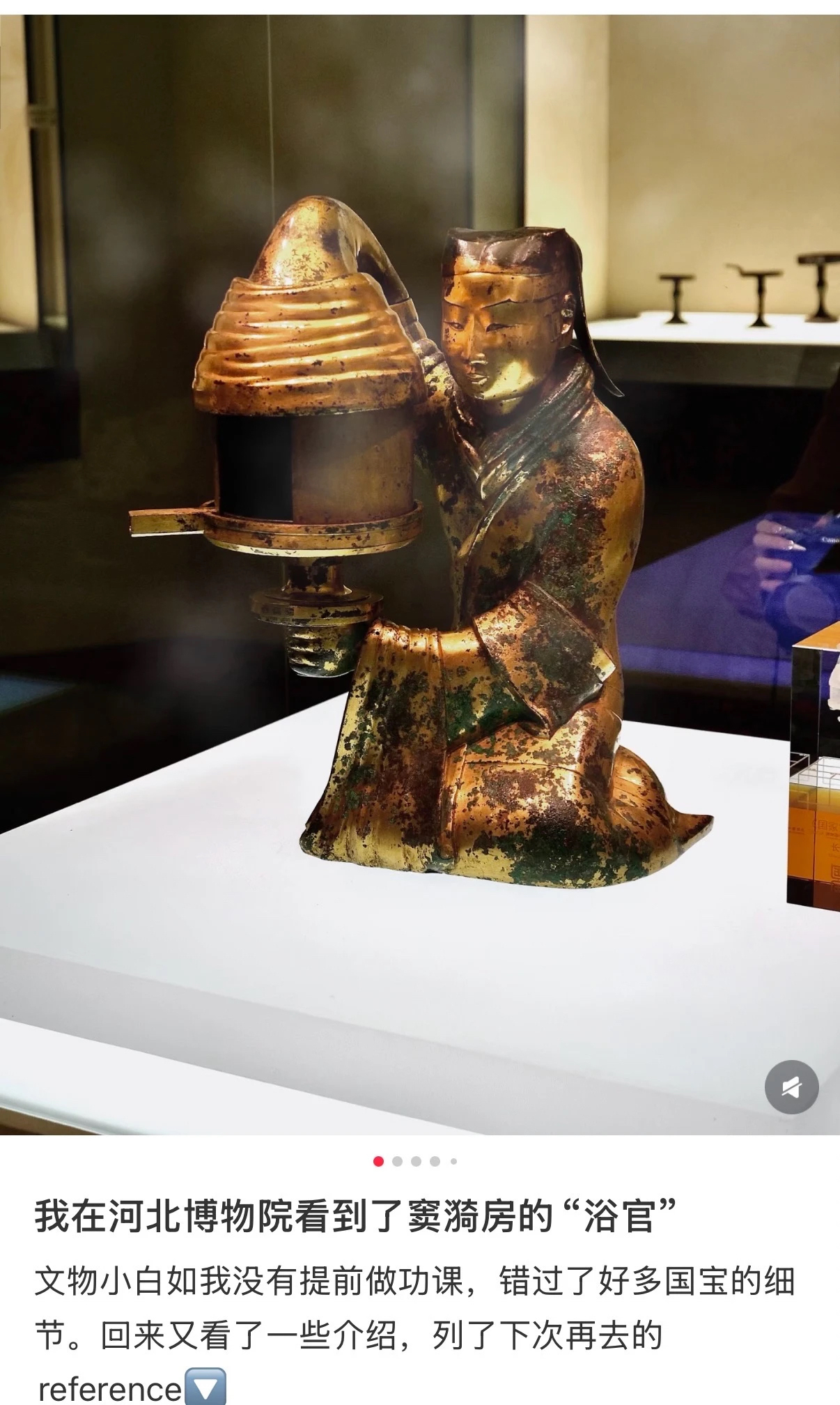 “印象最深刻的就是长信宫灯,文物造型非常形象生动,在了解到它的用途及环保理念后,更加觉得有意思。”吴女士在社交平台上专门分享了一长段文字:宫灯上有“长信尚浴”的铭文,窦太后的长信宫浴室用过该灯;每个部分都可以拆下来清理(有洁癖的人狂喜)……这一刻,吴女士不禁为古人的智慧与创意点赞。